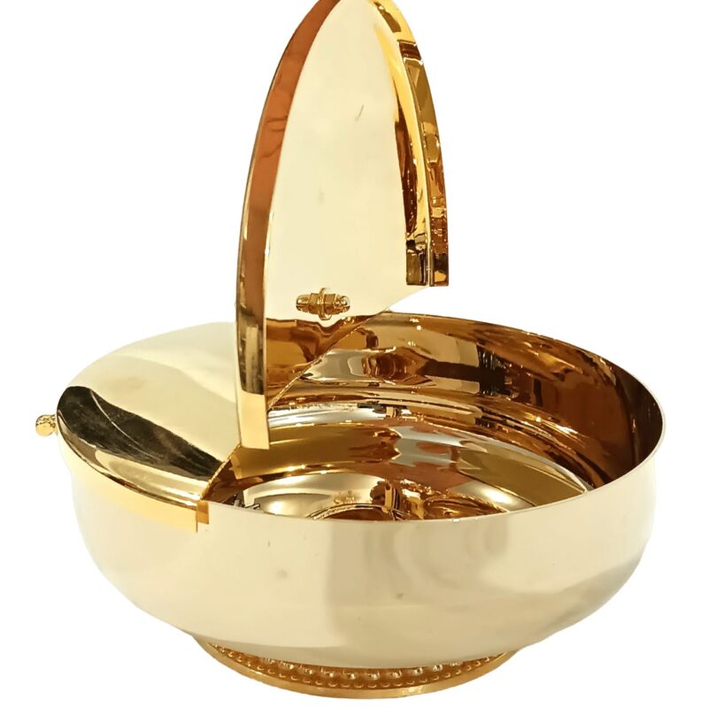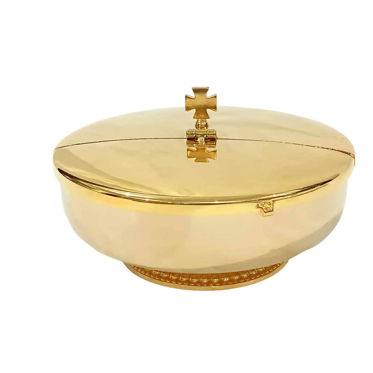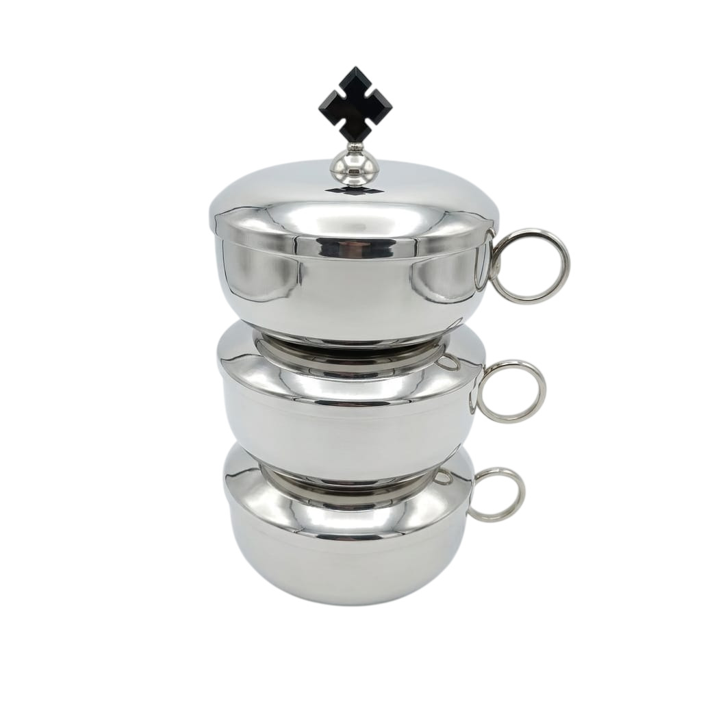 Produzida em material resistente com banho niquelado, a peça apresenta excelente durabilidade e brilho discreto, conferindo sobriedade e beleza ao serviço do altar. Seu diferencial está na divisão interna tripla, que permite melhor organização das partículas, facilitando a distribuição durante a liturgia.