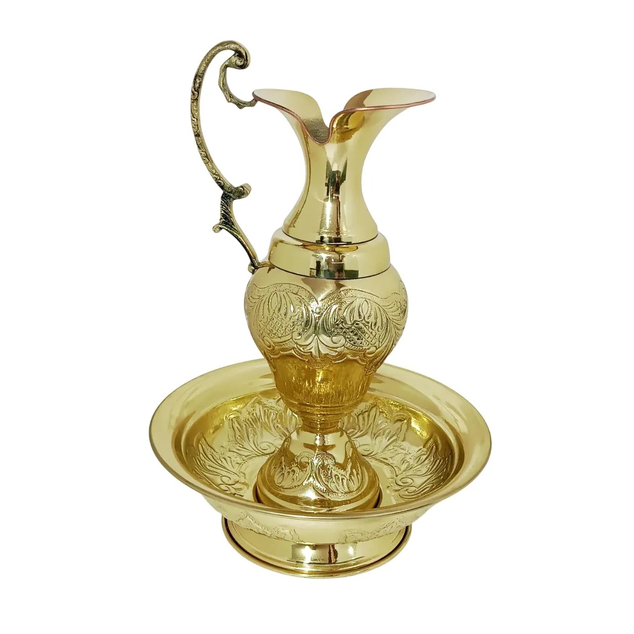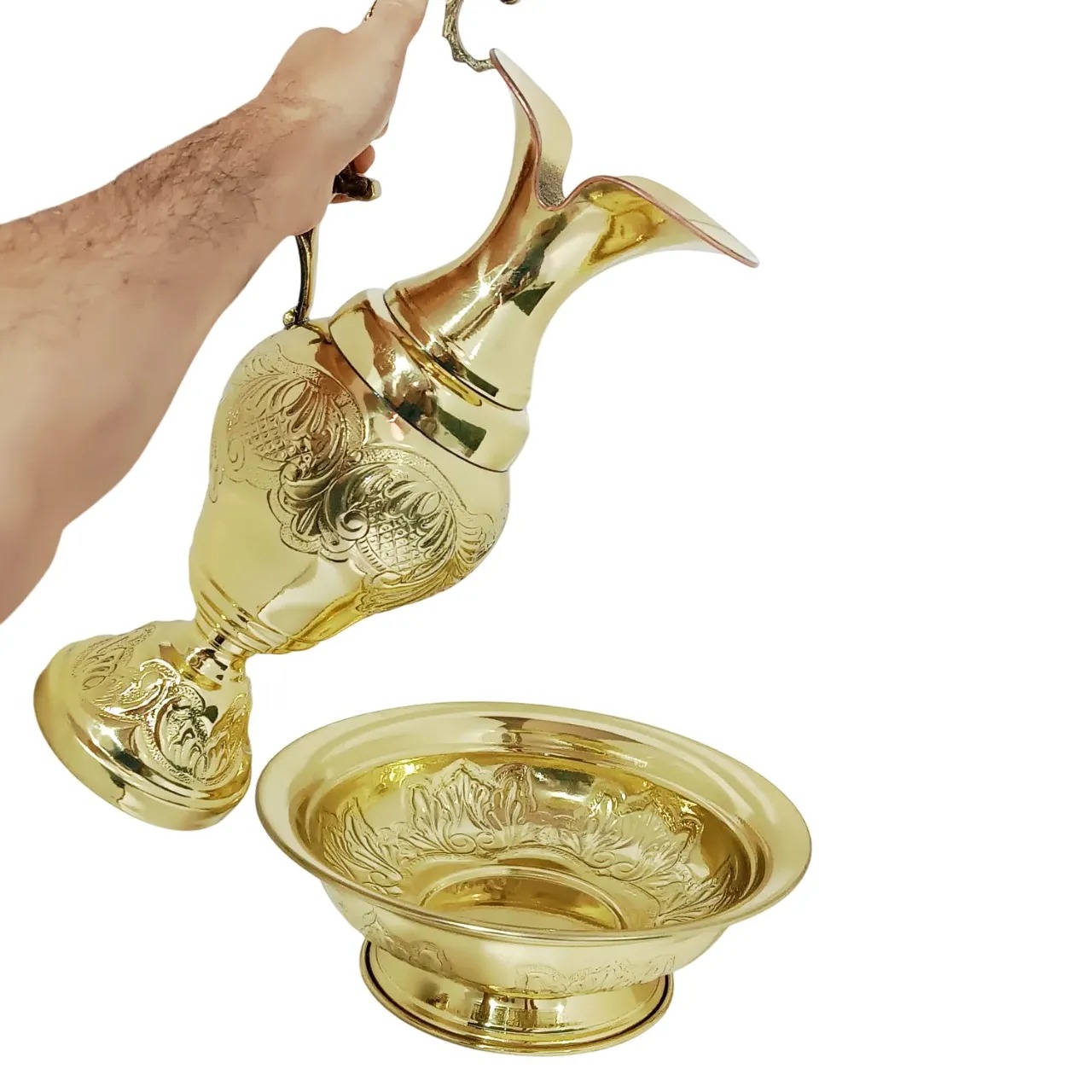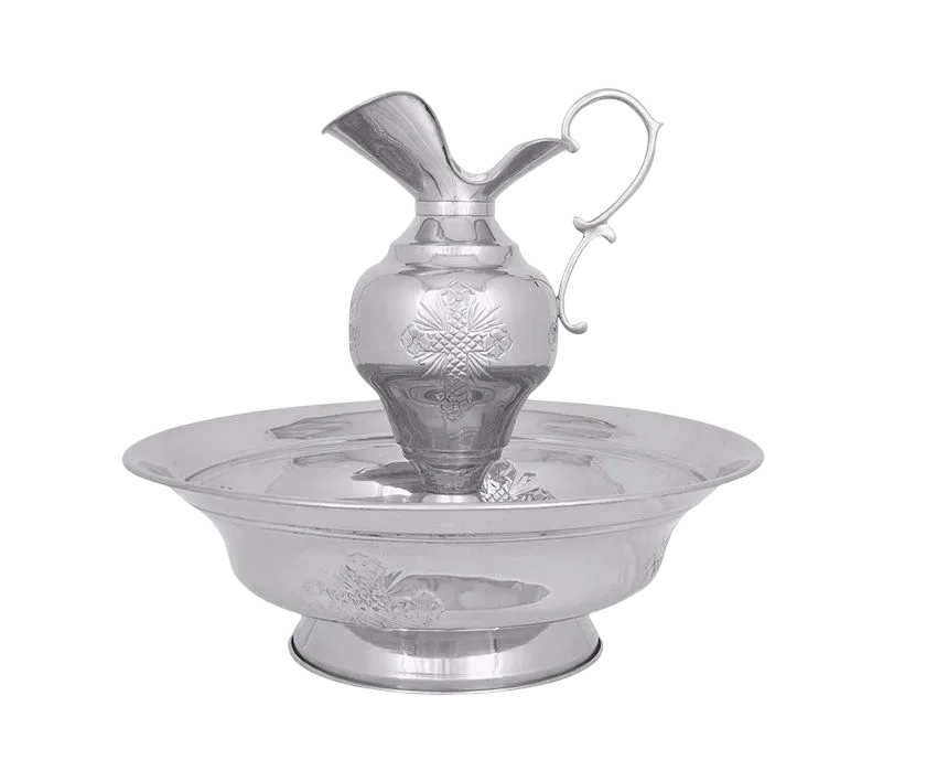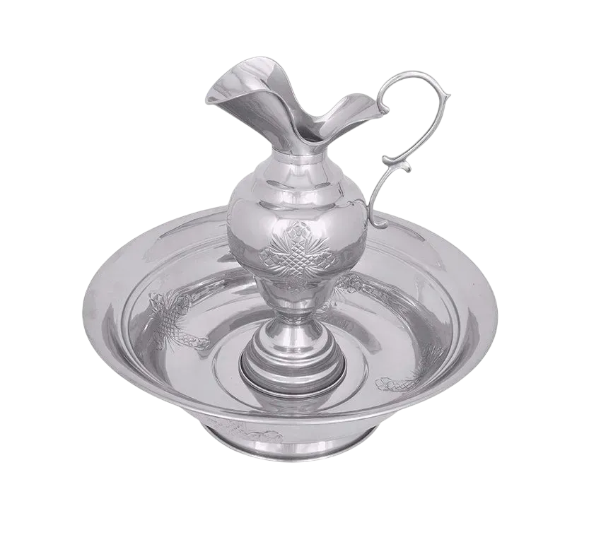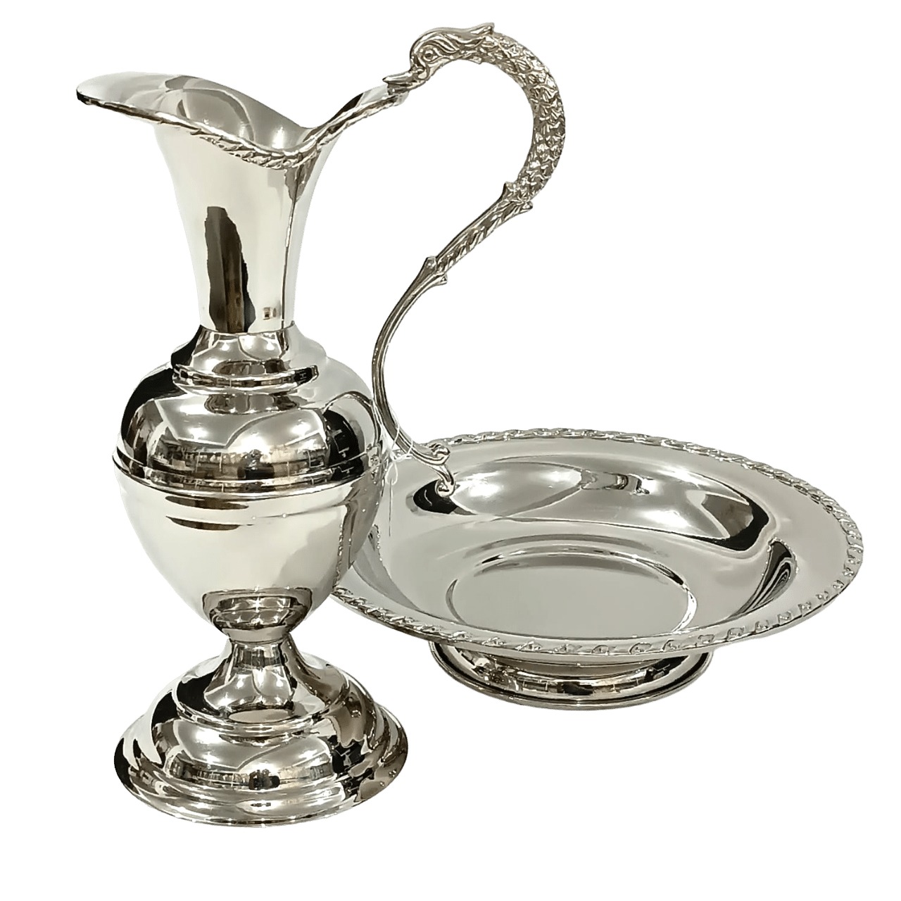 Jarra com bacia, tamanho médio. Prata. Feito em latão e cinzelado à mão