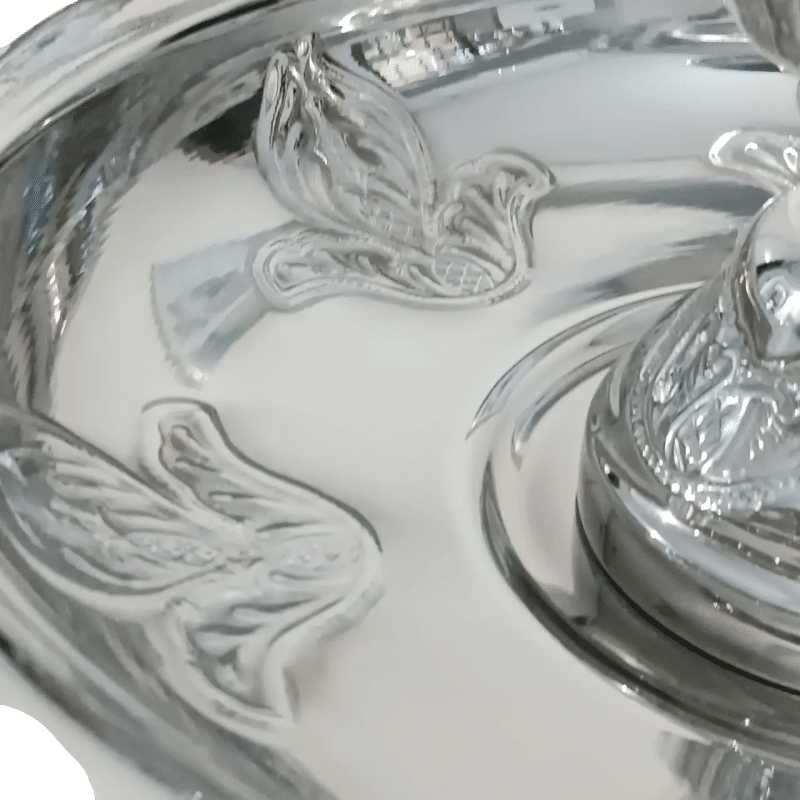 Jarra com bacia, tamanho grande. Prata. Feito em latão e cinzelado à mão.