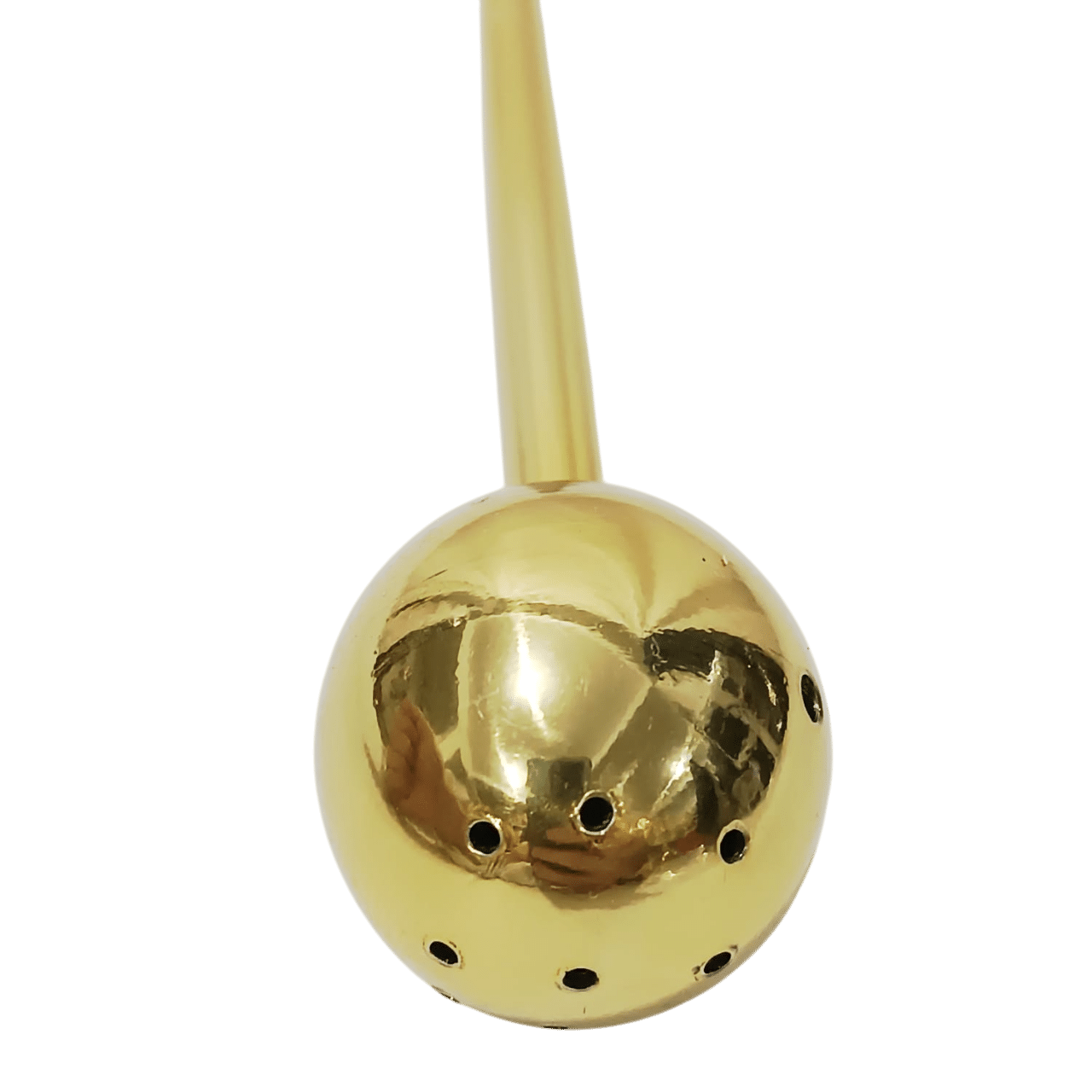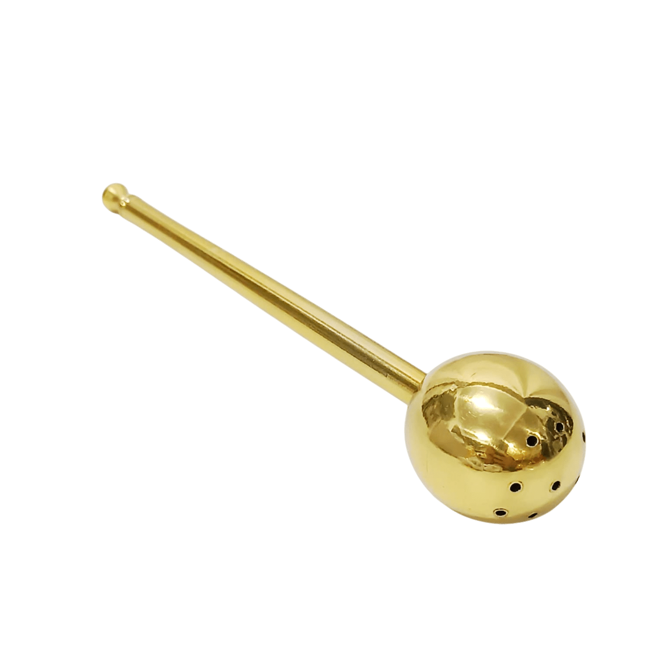 Aspersório litúrgico confeccionado em estanho com banho dourado de alto brilho. Possui formato clássico com cabeça perfurada e haste alongada, ideal para ritos de aspersão com água benta. Acabamento polido e resistente.