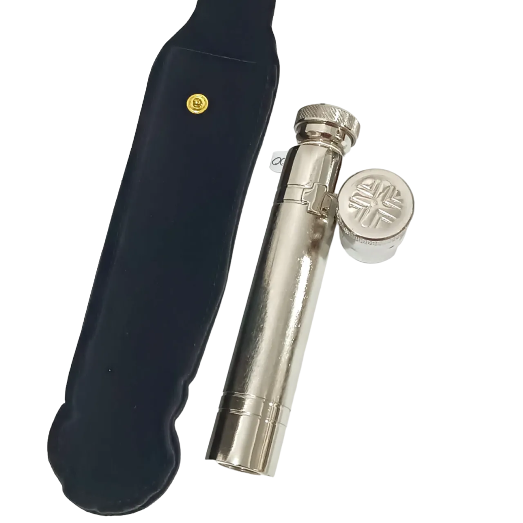 Asperge Italiano com Vaso de Santos Óleos Artigo Niquelado com 17cm de comprimento. Acompanha capa