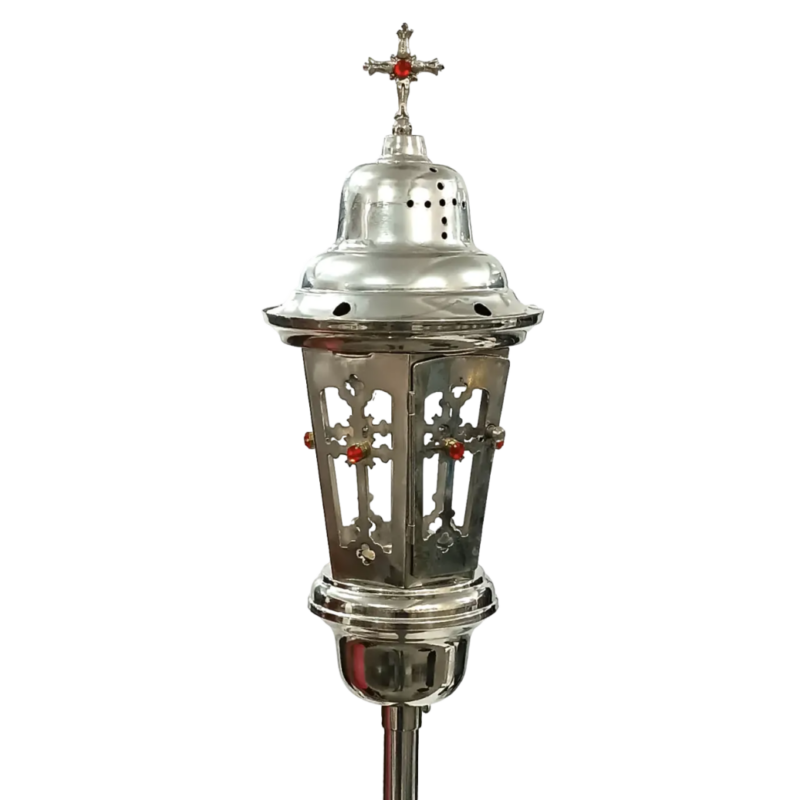 Base para cruz e tocheiro fabricada em alumínio fundido com jatos de tinta dourado.