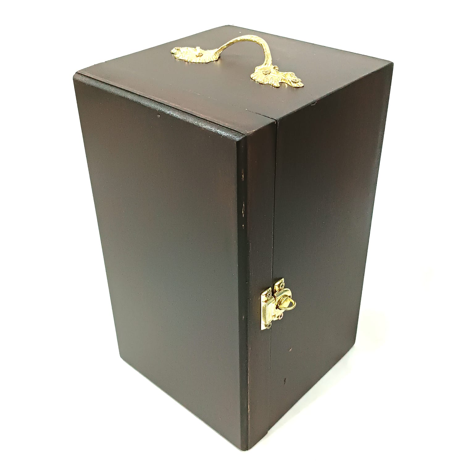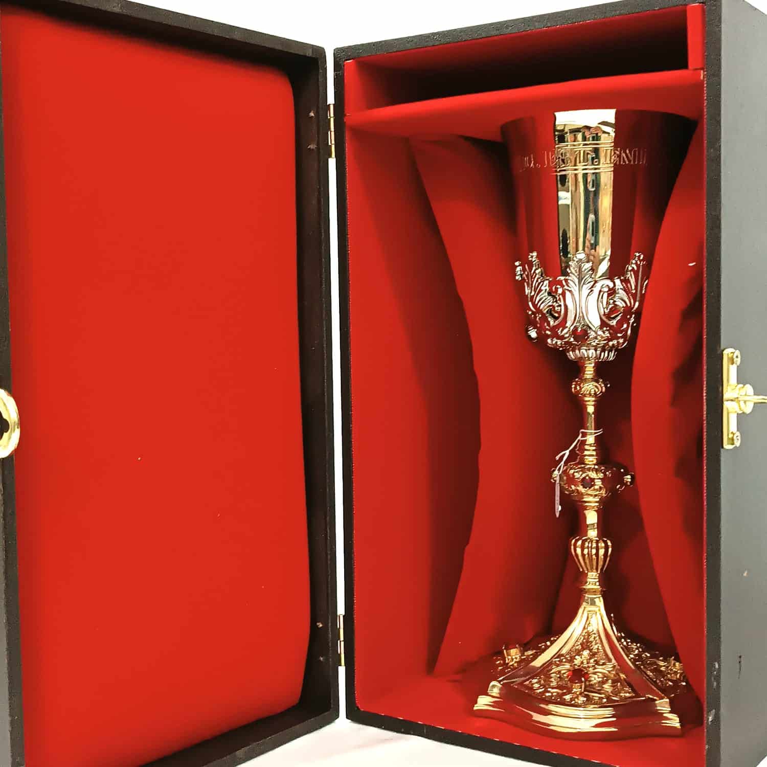 Estojo para cálice de madeira, com trava e alça em metal dourado. Acochoada internamente, para protejer o cálice e forrada em veluda. Possui porta patena. Suporta quase todos modelos de cálice até altura de 33cm. Favor antes de realizar a compra, consultar um dos nossos atendentes para verificar se seu cálice caberia aqui