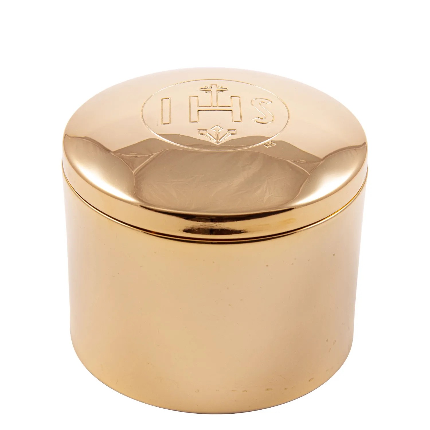 Caixa para hóstias em latão dourado. O símbolo IHS está gravado na tampa.