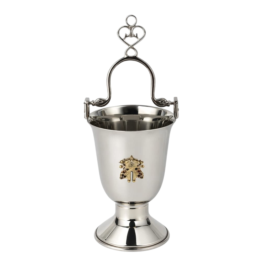 Caldeira litúrgica de fino acabamento, desenvolvida para celebrações que pedem elegância, tradição e significado. Confeccionada em metal com acabamento prateado de alto brilho, esta peça se destaca pelo seu design clássico aliado a delicados elementos decorativos.