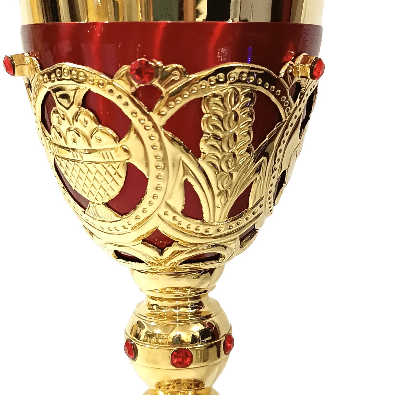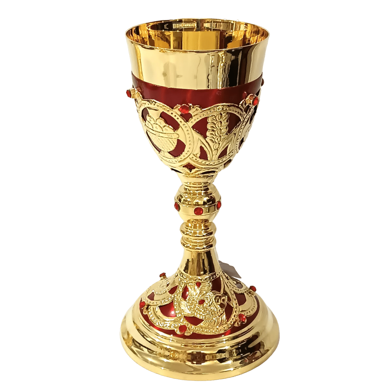 Cálice Litúrgico Banhado a Ouro 24k com Pedras Vermelhas e Gravação de Pães e Peixes.
