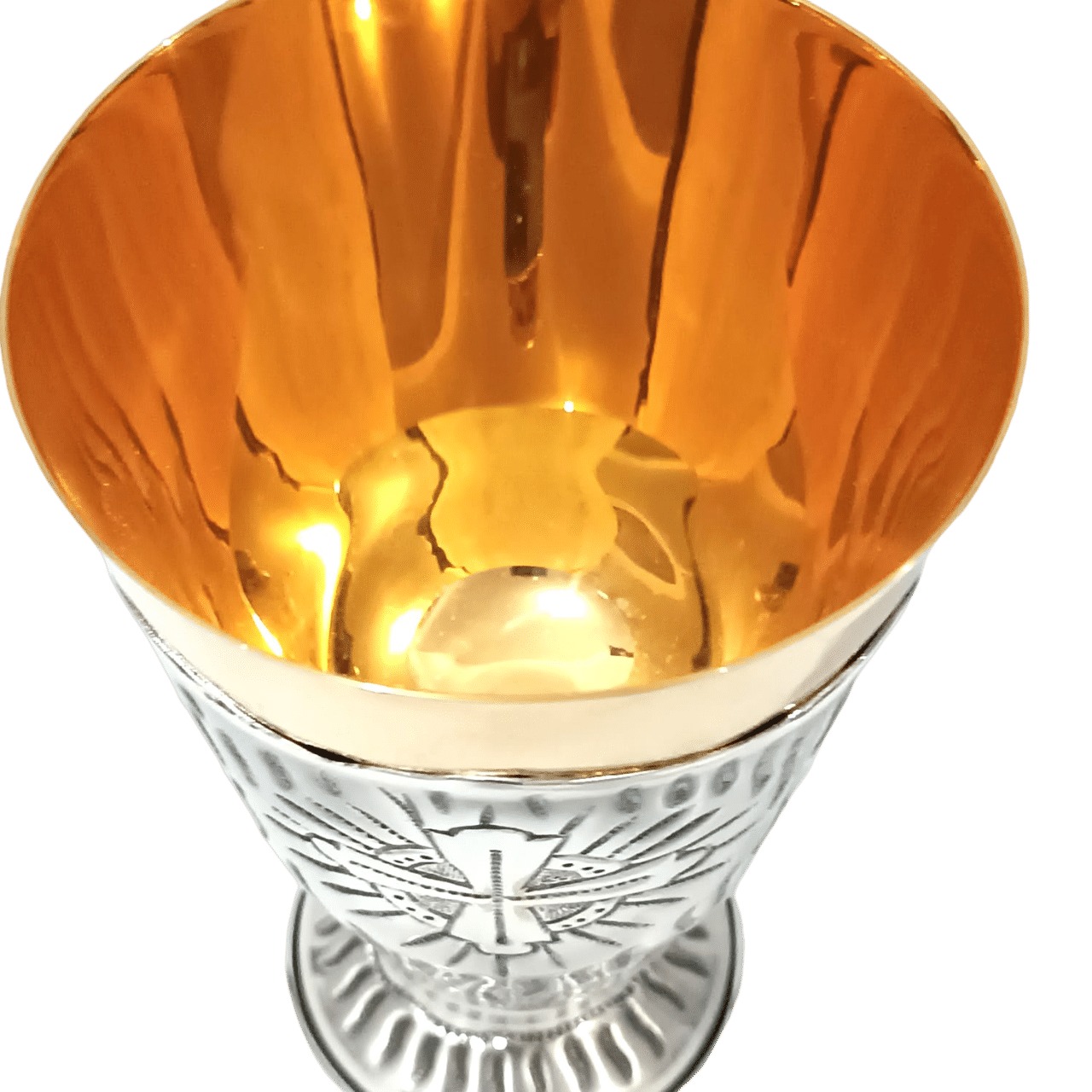 Cálice litúrgico italiano em formato de taça. Feito em latão com banho de ouro 24k. A base é totalmente cinzelada a mão