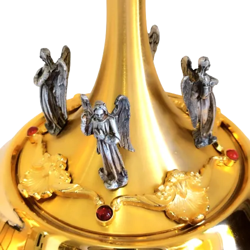 Um exemplo notável de arte sacra, especialmente pelo seu estilo barroco rococó, que é conhecido por sua opulência e detalhes ornamentais. A combinação de ouro 24k e prata é um indicativo de alta qualidade e luxo. O estilo barroco rococó é caracterizado por formas exuberantes e detalhadas, e a presença de anjos e pedras verdadeiras acrescenta um nível de sofisticação e beleza.