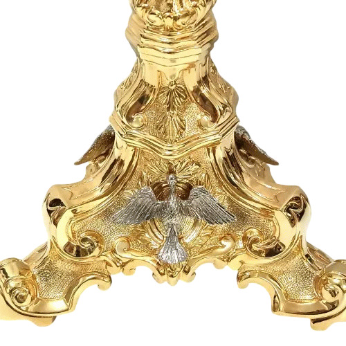 Um exemplo notável de arte sacra, especialmente pelo seu estilo barroco rococó, que é conhecido por sua opulência e detalhes ornamentais. A combinação de ouro 24k e prata é um indicativo de alta qualidade e luxo. O estilo barroco rococó é caracterizado por formas exuberantes e detalhadas, e a presença de anjos e pedras verdadeiras acrescenta um nível de sofisticação e beleza.