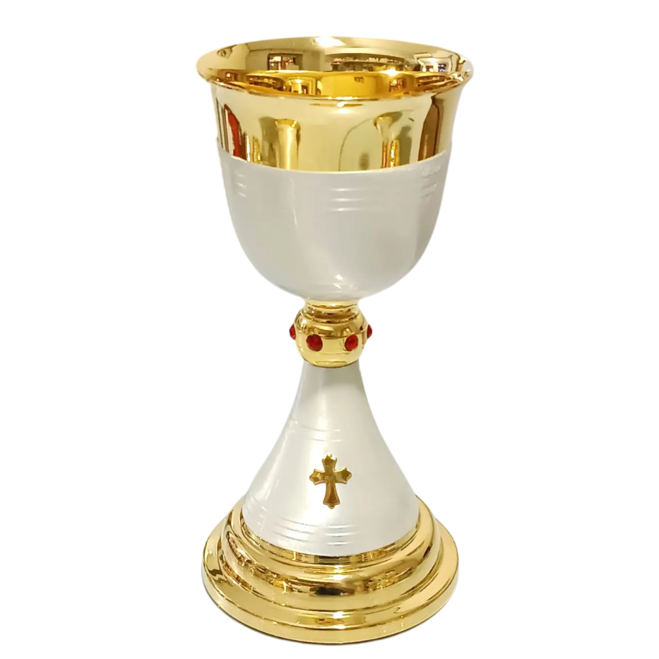Cálice litúrgico italiano, confeccionado em latão polido e banhado a ouro 24k. Este cálice se destaca pela capa de proteção escovada esmaltalda branca, que realça sua beleza e pela cruz delicadamente inserida na base. Além disso, pedras adornam a coluna, acrescentando um toque de sofisticação. Uma peça moderna e única, digno de para a celebração do Sacrifício Eucarístico
