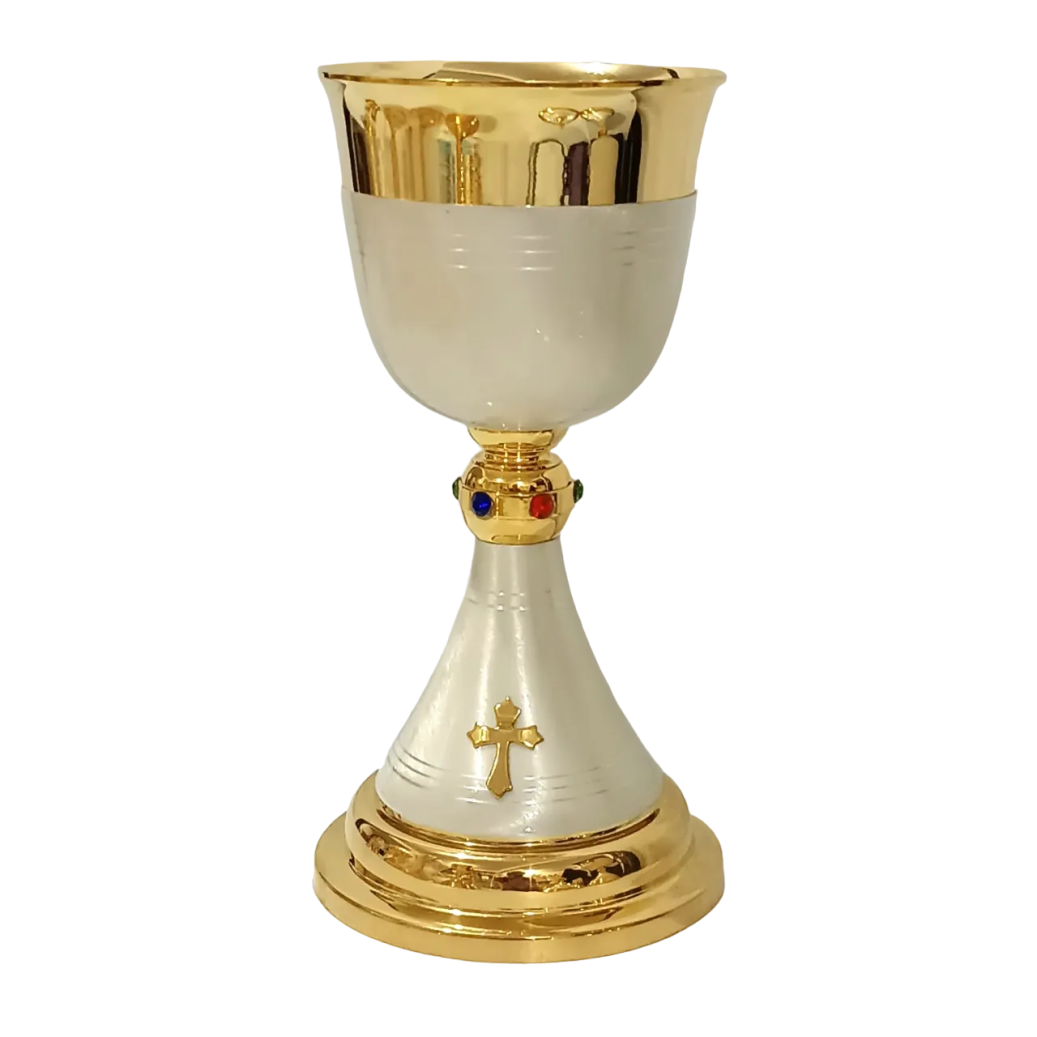 Cálice litúrgico italiano, confeccionado em latão polido e banhado a ouro 24k. Este cálice se destaca pela capa de proteção escovada esmaltalda branca, que realça sua beleza e pela cruz delicadamente inserida na base. Além disso, pedras adornam a coluna, acrescentando um toque de sofisticação. Uma peça moderna e única, digno de para a celebração do Sacrifício Eucarístico