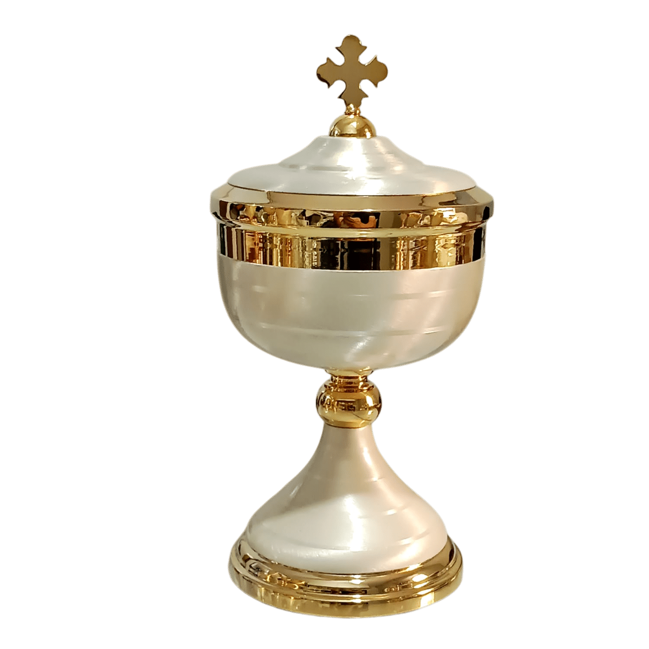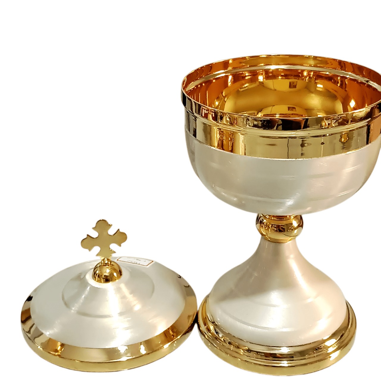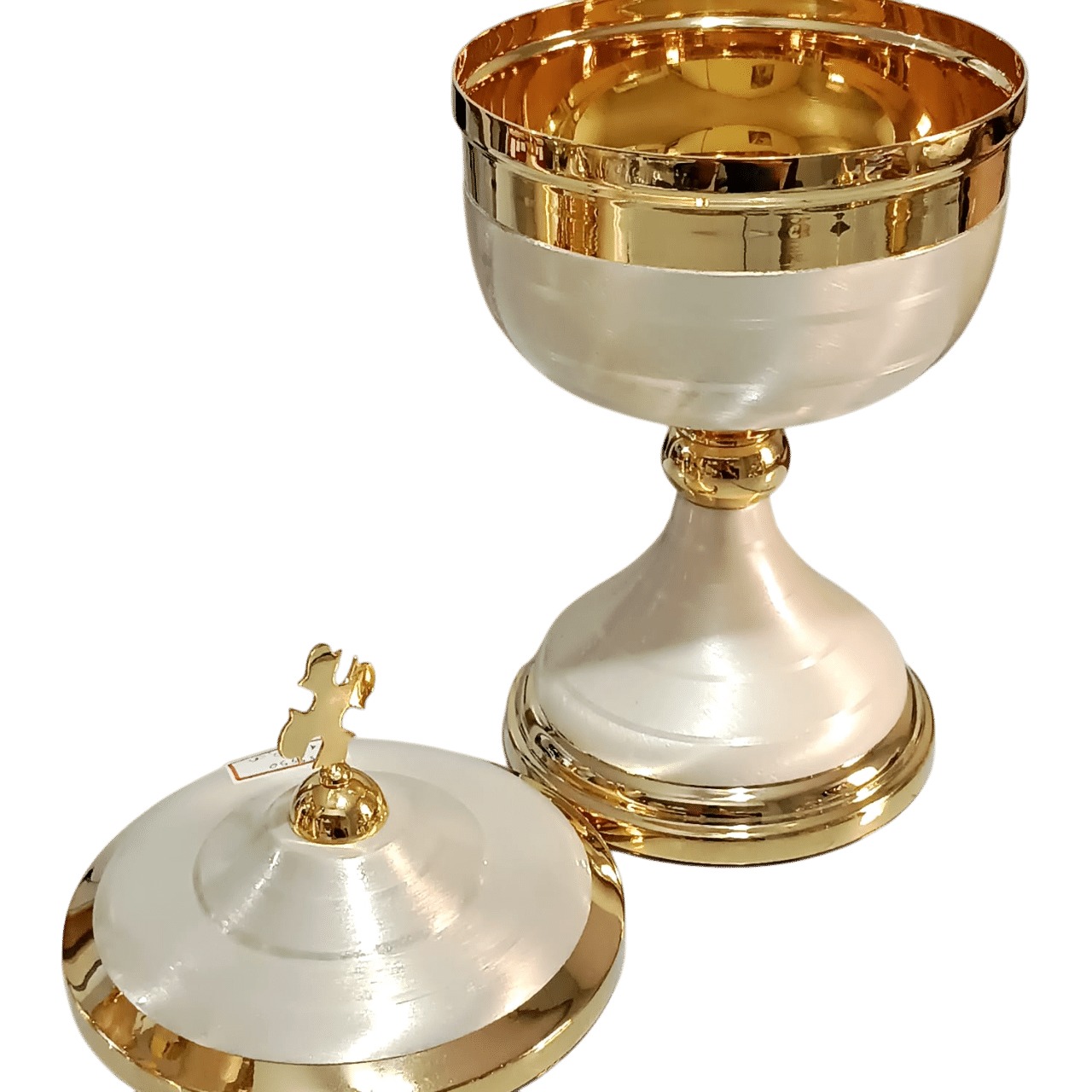 âmbula litúrgica italiana, confeccionada em latão polido e banhado a ouro 24k. Este cálice se destaca pela capa de proteção escovada esmaltalda branca, que realça sua beleza e pela cruz delicadamente inserida na tampa, acrescentando um toque de sofisticação. Uma peça moderna e única, digno de para a celebração do Sacrifício Eucarístico.