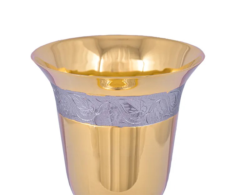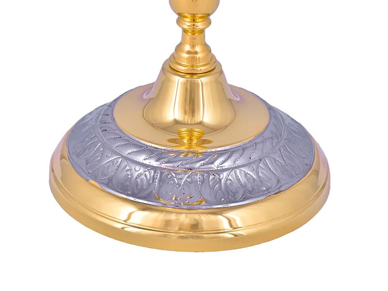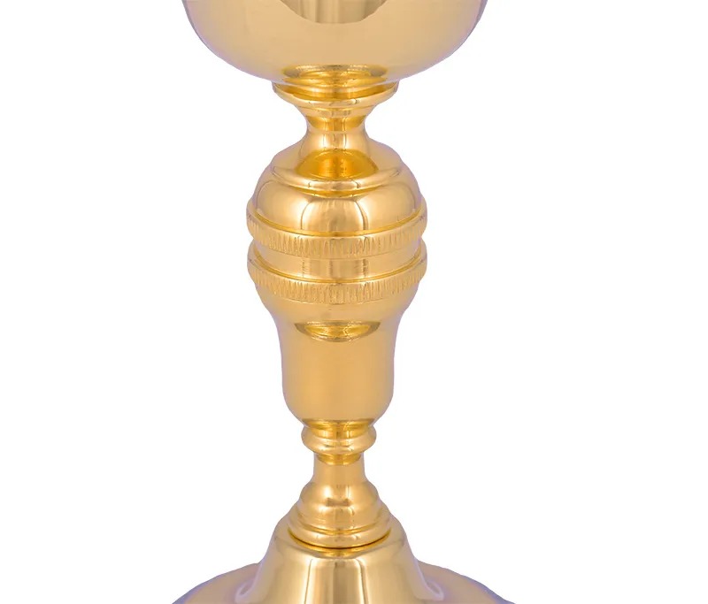 O Cálice 622 é produzido em uma liga metálica com banho dourado. Detalhes niquelados. Obra de arte. Atenção: Não acompanha patena.