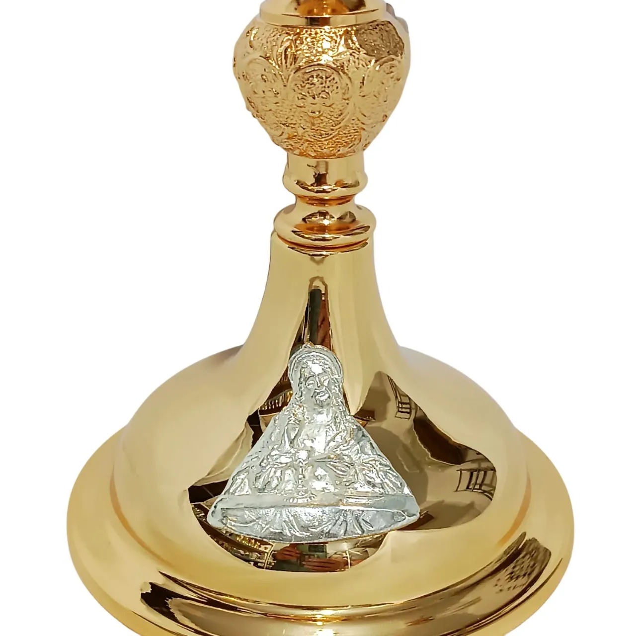 O Cálice a026 é produzido na Itália em dourado em latão polido, com banho de ouro 24k. Na base possui a figura de Cristo partindo o pão e na coluna anjos barrocos. Cálice alto.