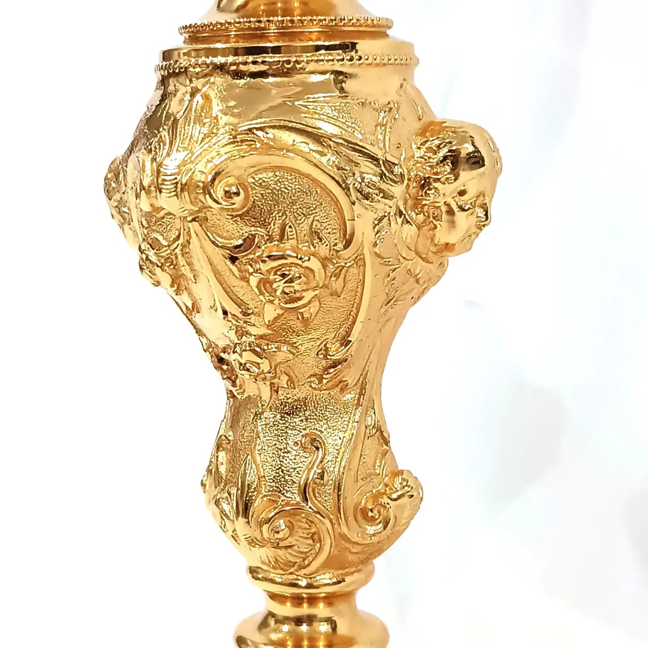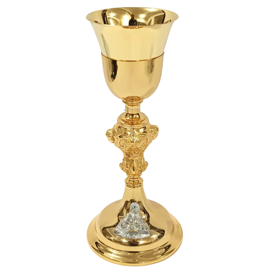 Cálice dourado em latão polido, com banho de ouro 24k. Na base possui a figura de Cristo partindo o pão e na coluna anjos barrocos. Cálice alto.