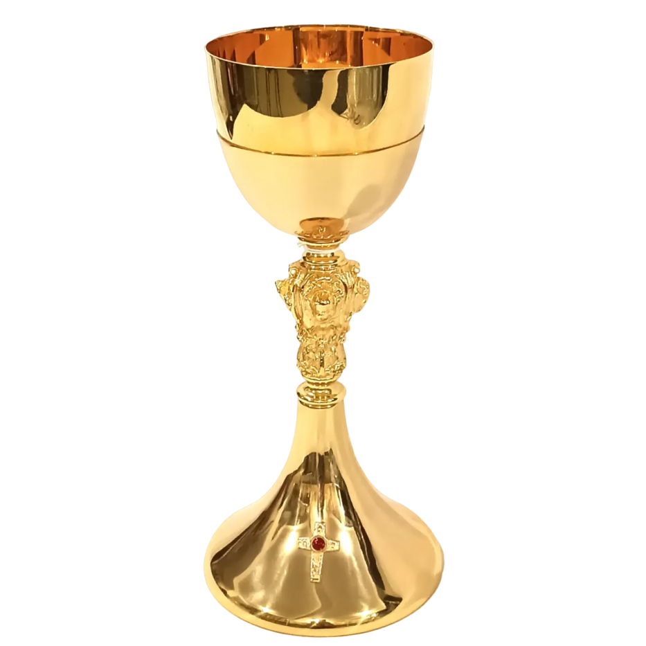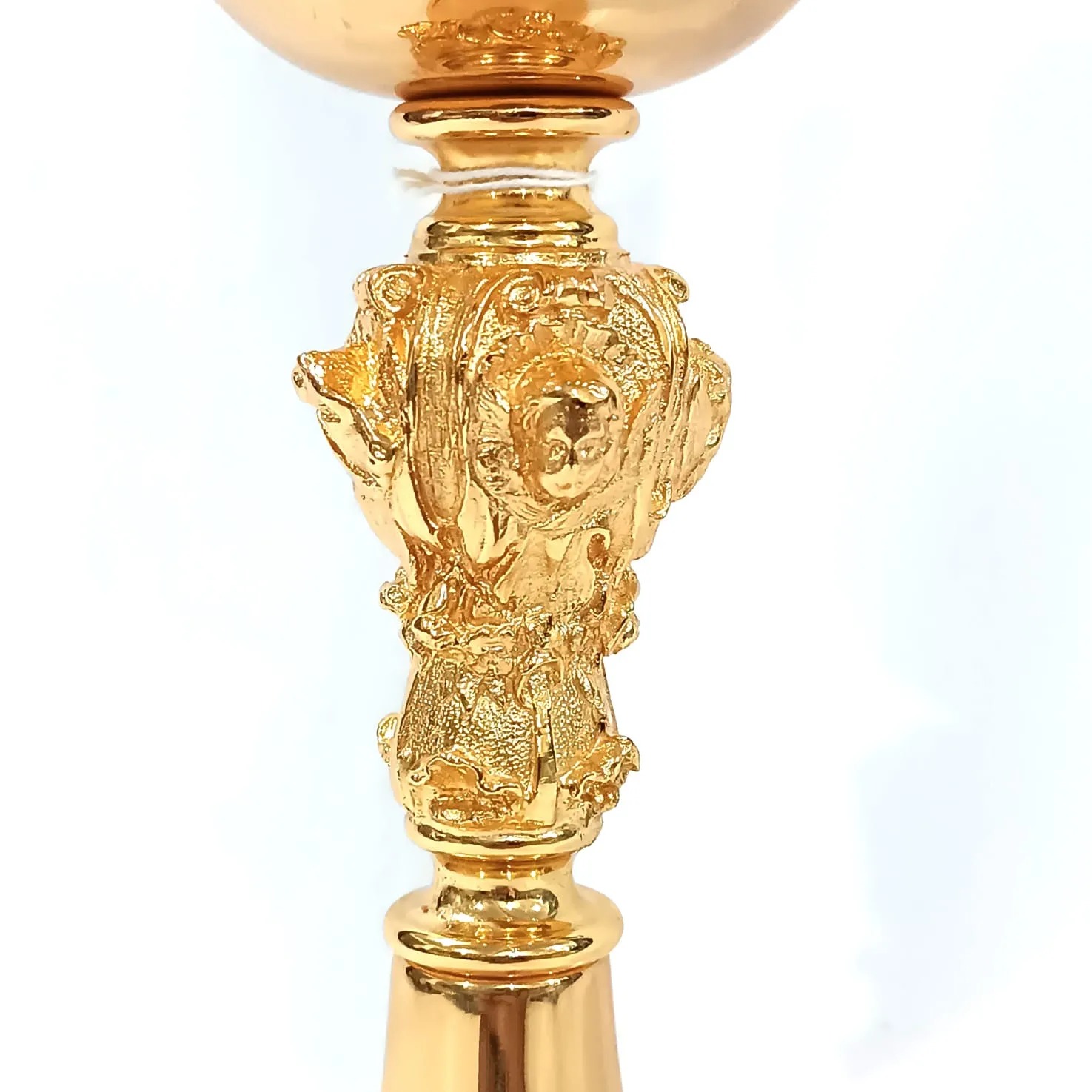 Cálice dourado em latão polido, com banho de ouro 24k. Na base possui cruz com uma pedra vermelha. Na coluna a figura dos 4 evangelistas. Calice alto.