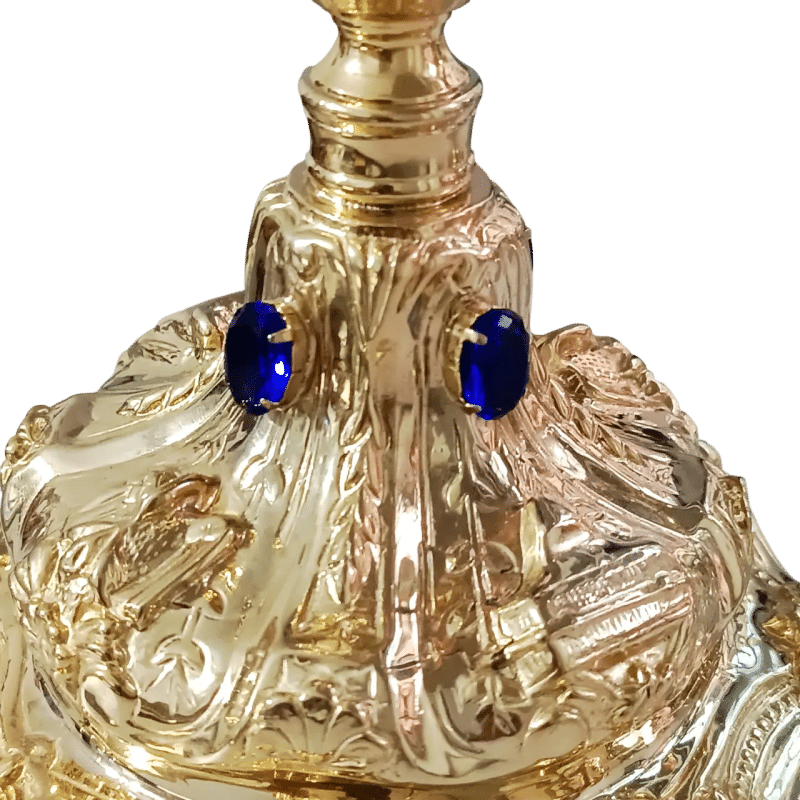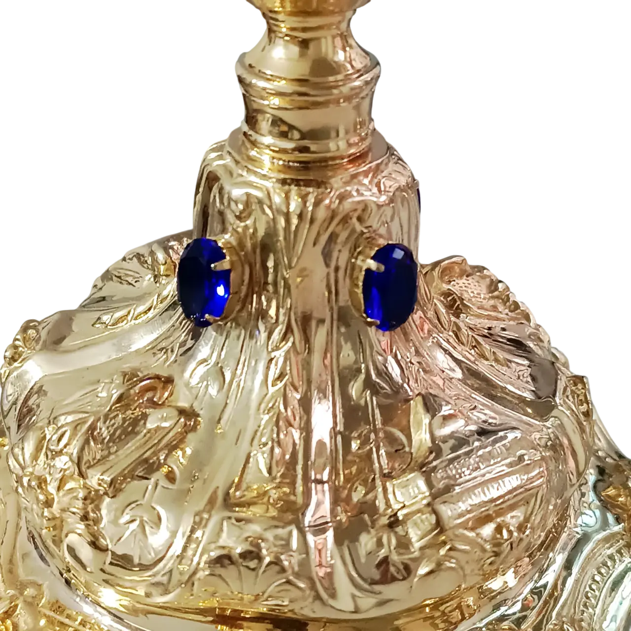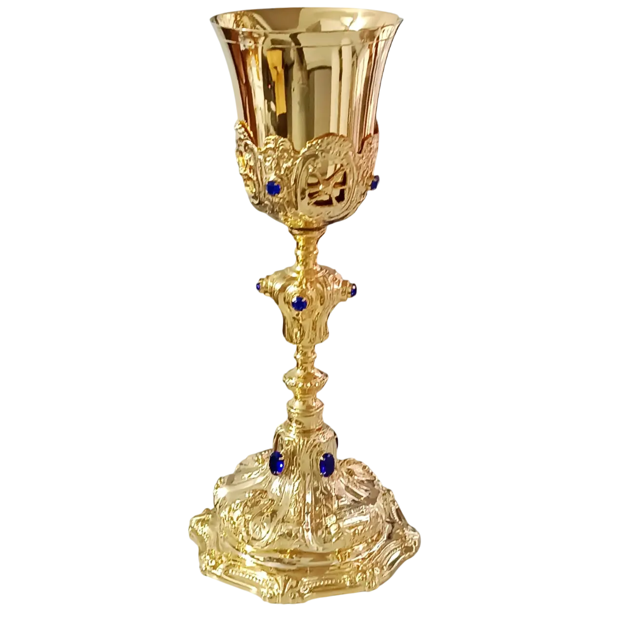 Belissímo cálice em estilo barroco com diversa figuras fundidas.