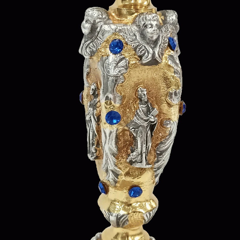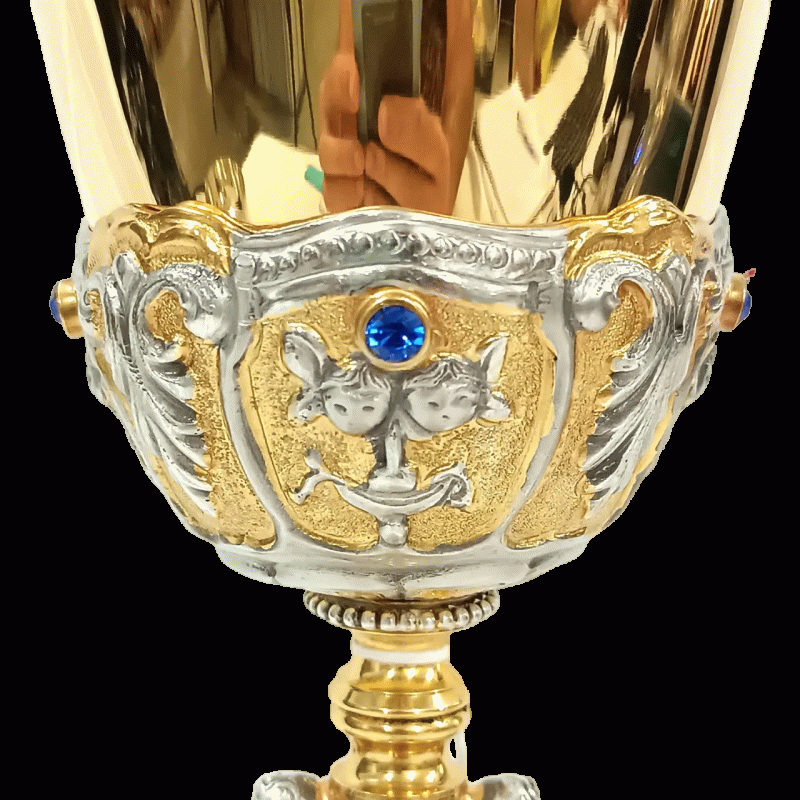 Cálice Basílica é um dos cálices mais imponentes existentes. Fundido em latão e cinzelado à mão (arte de entalhar o metal), chama atenção sua lindas pedrarias azuis