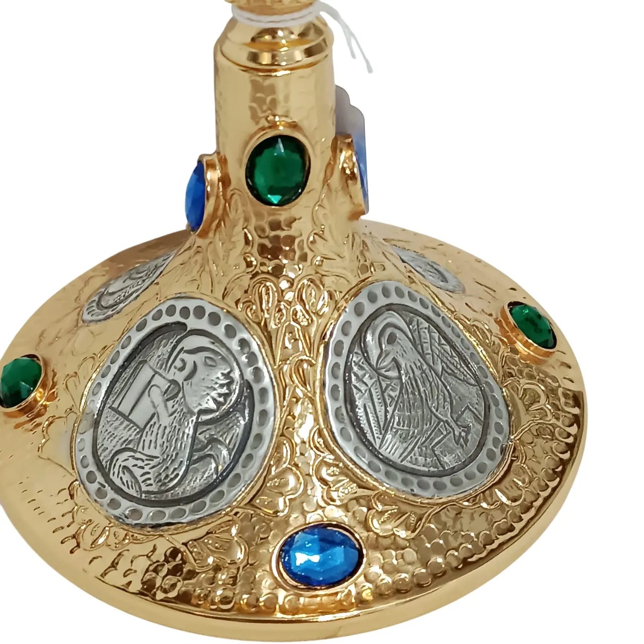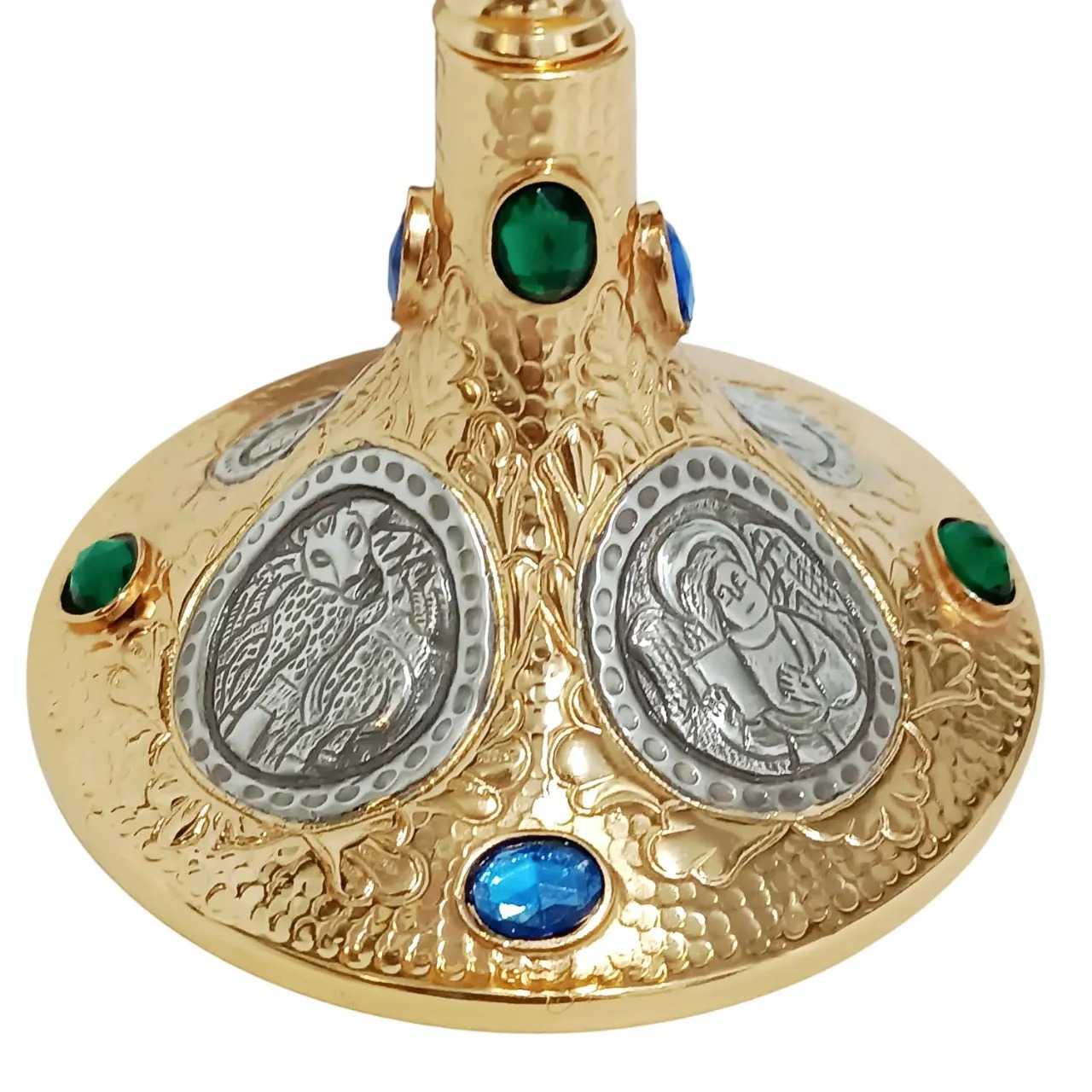 O Cálice Evangelium Vitae na base traz em relevo os quatro Evangelistas, cuidadosamente trabalhados em medalhões de metal, enriquecidos com pedras em tons de azul e verde que realçam a beleza da peça. Recebeu ainda um fino banho de ouro 24k, que proporciona brilho intenso, nobreza e longa durabilidade.