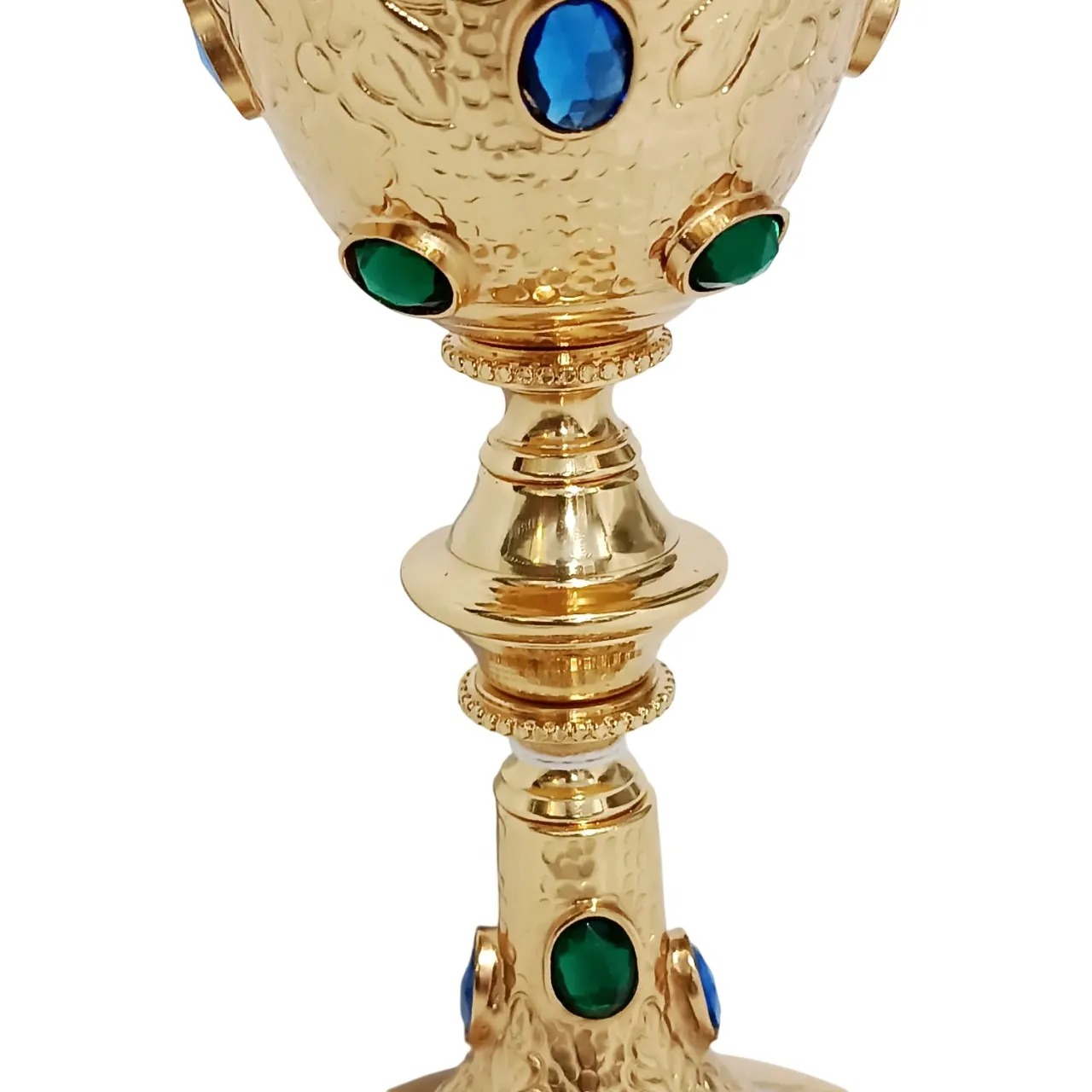 Cálice italiano confeccionado artesanalmente pelo tradicional sistema de cinzelagem manual, o que garante riqueza nos detalhes e acabamento exclusivo. Mede 24,5 cm de altura, com 9,7 cm de diâmetro na copa e 12,5 cm de diâmetro na base.