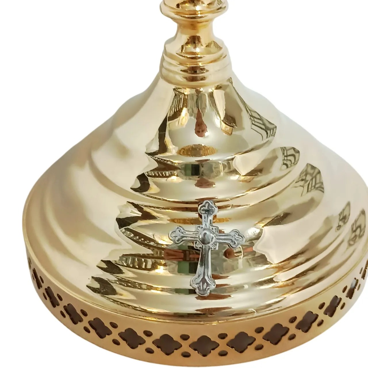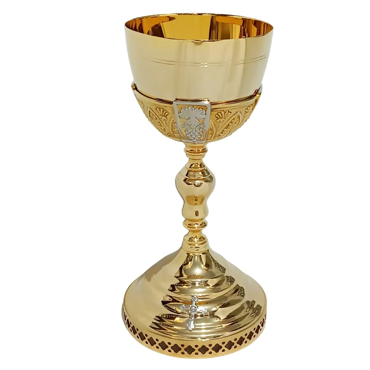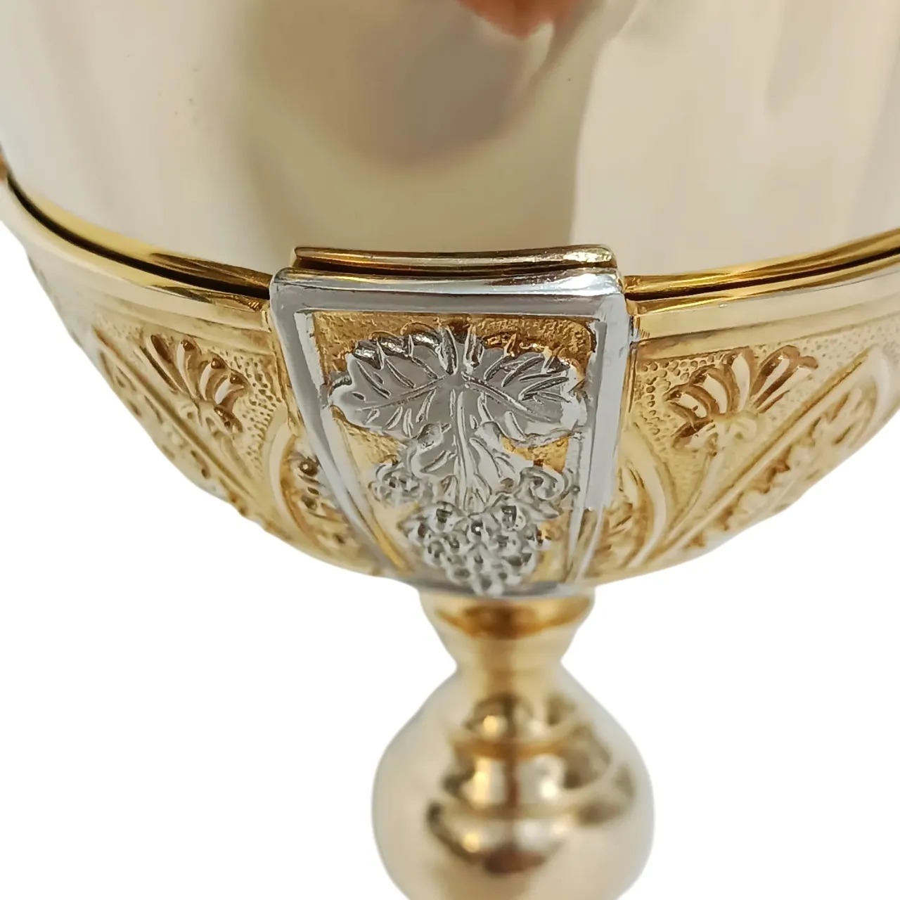 O Cálice Bosco é produzido com boa liga metálica com banho dourado na copa e, niquelado nos detalhes em relevo e na base.
