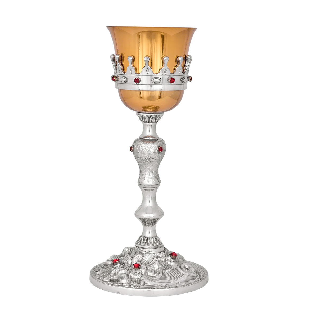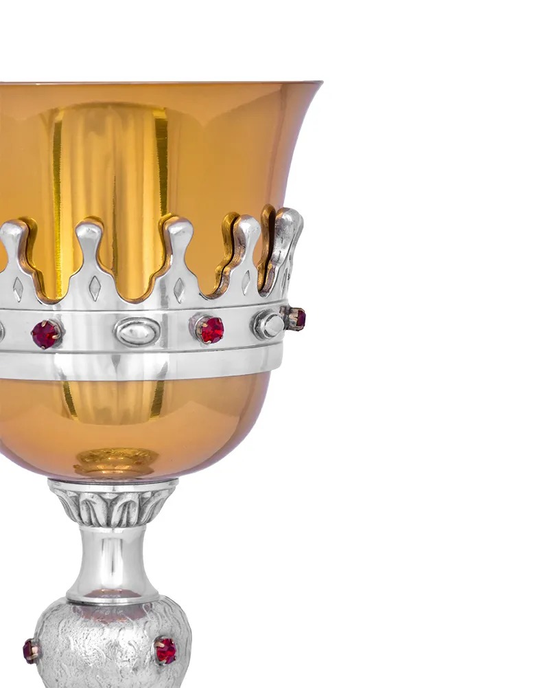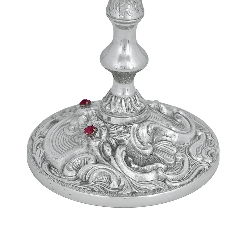 Cálice com Patena Trabalhado em dois acabamentos F545-1/F189-A. Fabricado em estanho, um metal nobre de excelente resistência e uma beleza inigualável. Este em específico conta com um design de maior imposição. Seu corpo todo trabalhado é de extrema beleza, desde a base até o bojo, além de contar com o acabamento em duas tonalidades. Acompanha patena, produzida em metal nobre.