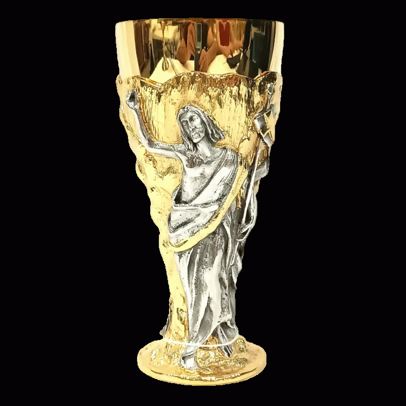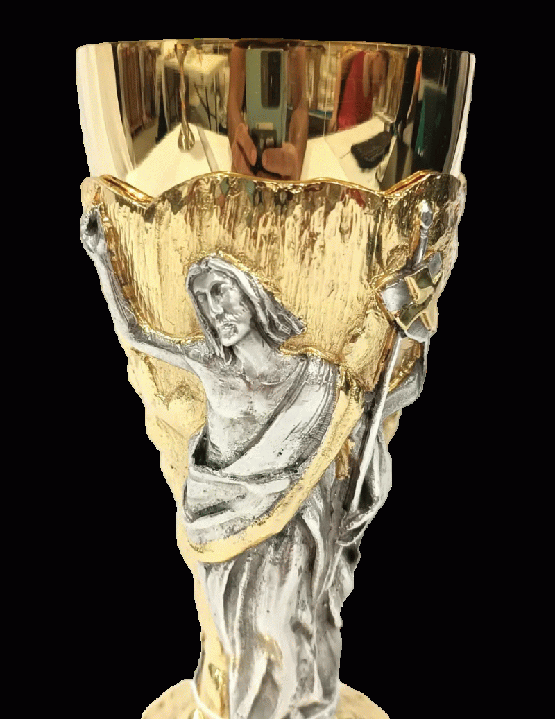 Calíce Cristo Ressucitado. Produzido pelo antigo sistema de cera perdida, feito totalmente em latão fundido, com banho bicolor de ouro 24k e prata de lei. Esse cálice é confeccionado artesanalmente.