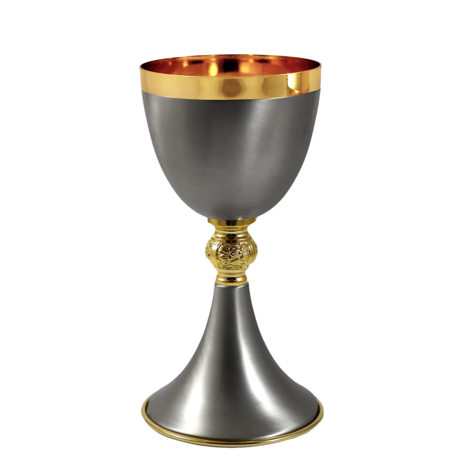 Cálice em latão dourado com base e copo em tom prateado acetinado com particular efeito mate. O nó é moldado em acabamento dourado com motivos barrocos
