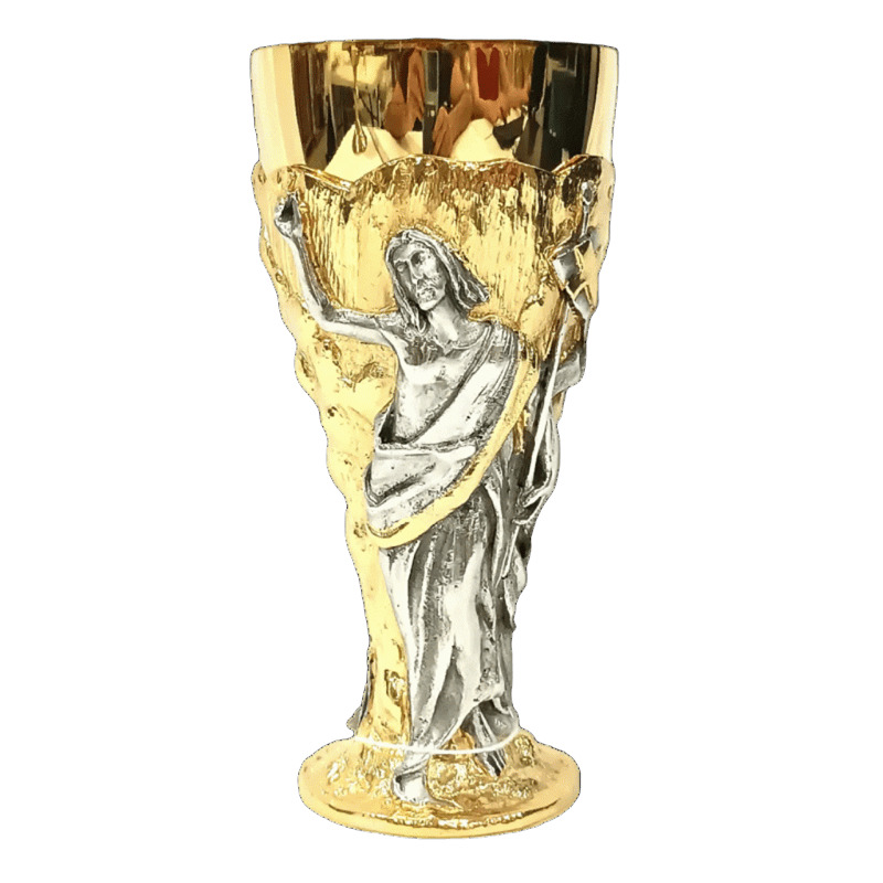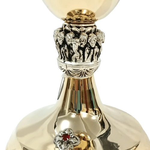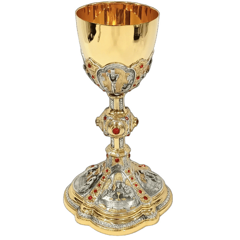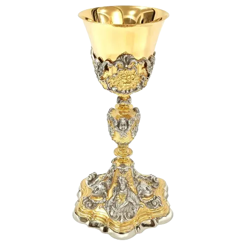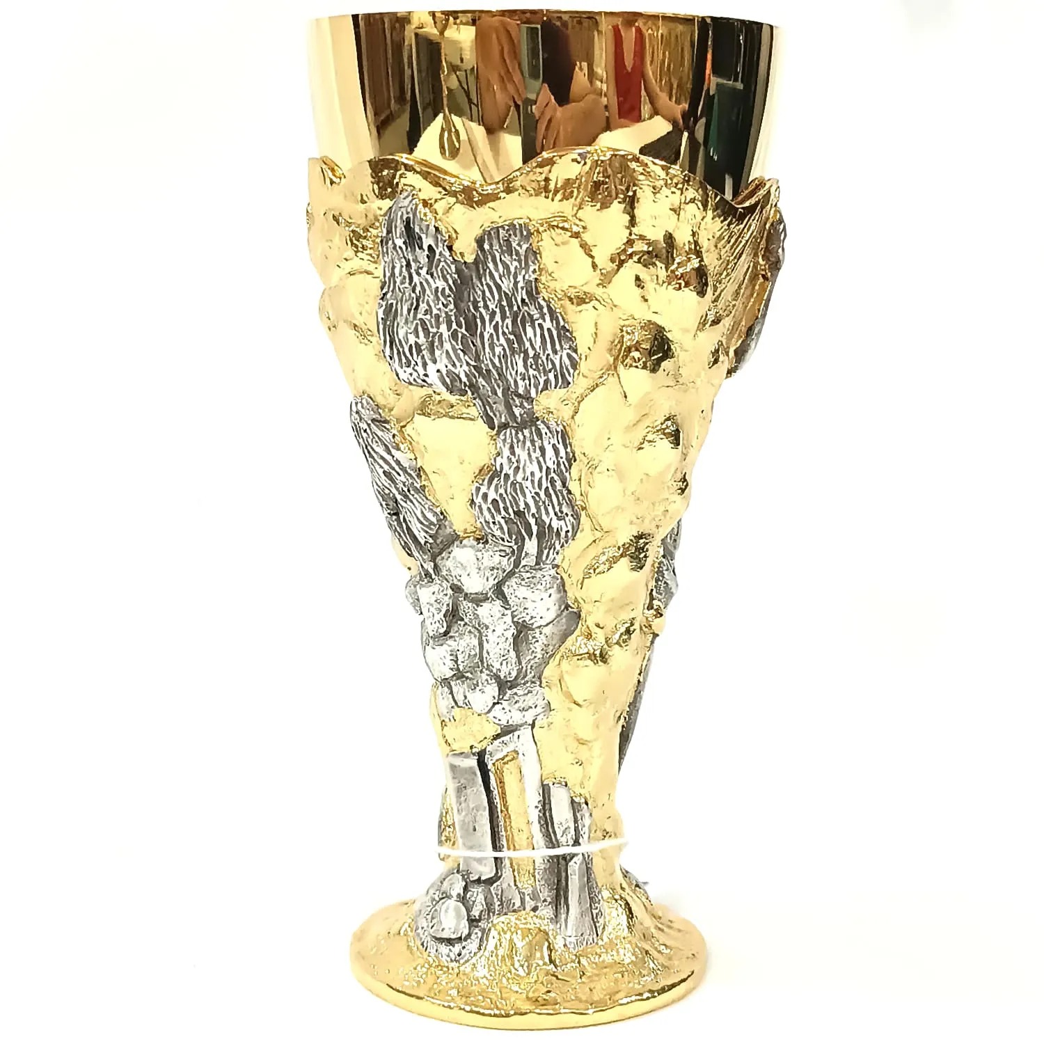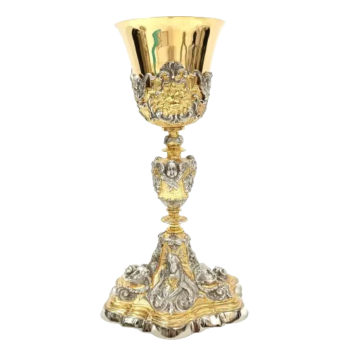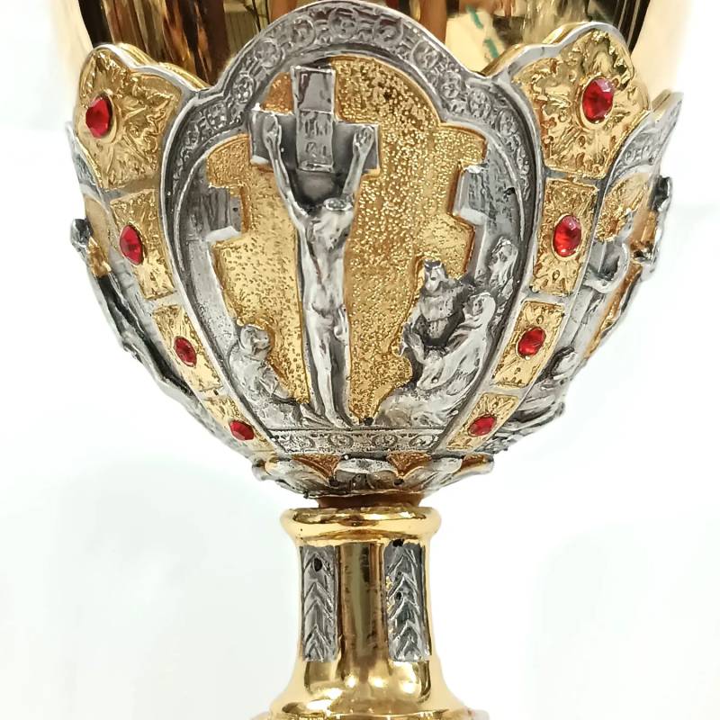 A copa dourada, com acabamento interno altamente polido, reflete a luz com intensidade, valorizando o momento sagrado da consagração. Em sua parte externa, os delicados ornamentos em acabamento prateado formam um contraste elegante, evidenciando cada detalhe com precisão e sofisticação.