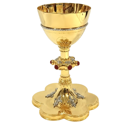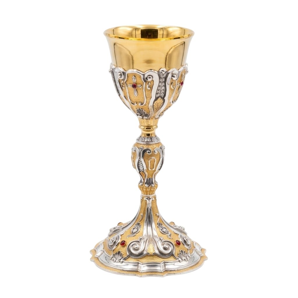 A copa, com interior totalmente polido, proporciona o brilho intenso característico das peças litúrgicas de alto padrão, garantindo também as condições adequadas para o uso sagrado. Ao redor da taça, delicados relevos decorativos com pequenas pedras em tom rubi acrescentam um toque de requinte e exclusividade.
