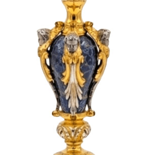 O nó central é artisticamente trabalhado com figuras em relevo e acabamento esmaltado escuro, criando um contraste elegante com o dourado predominante. Já o corpo do cálice traz delicados relevos e detalhes clássicos inspirados na tradição europeia, reforçando sua identidade nobre.
