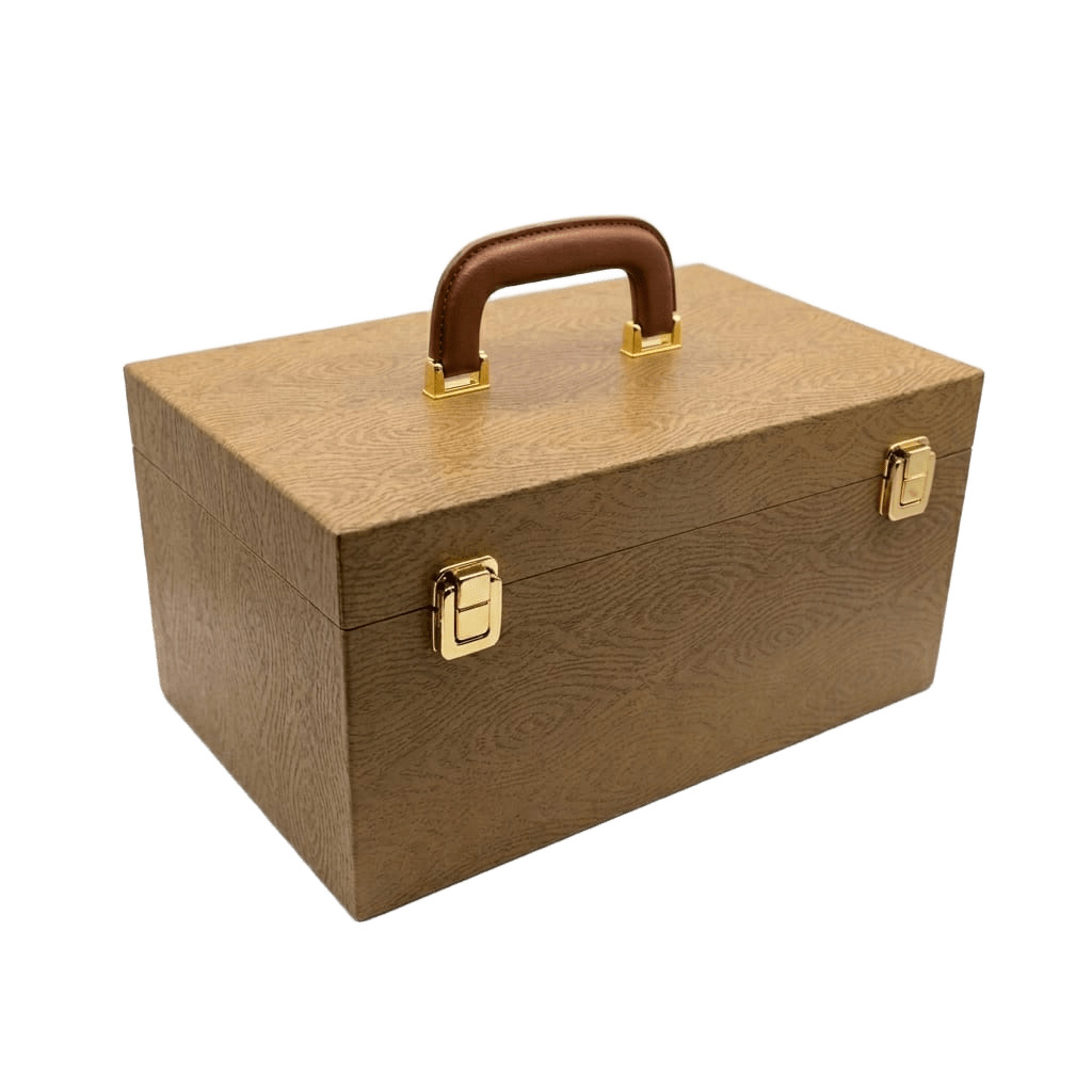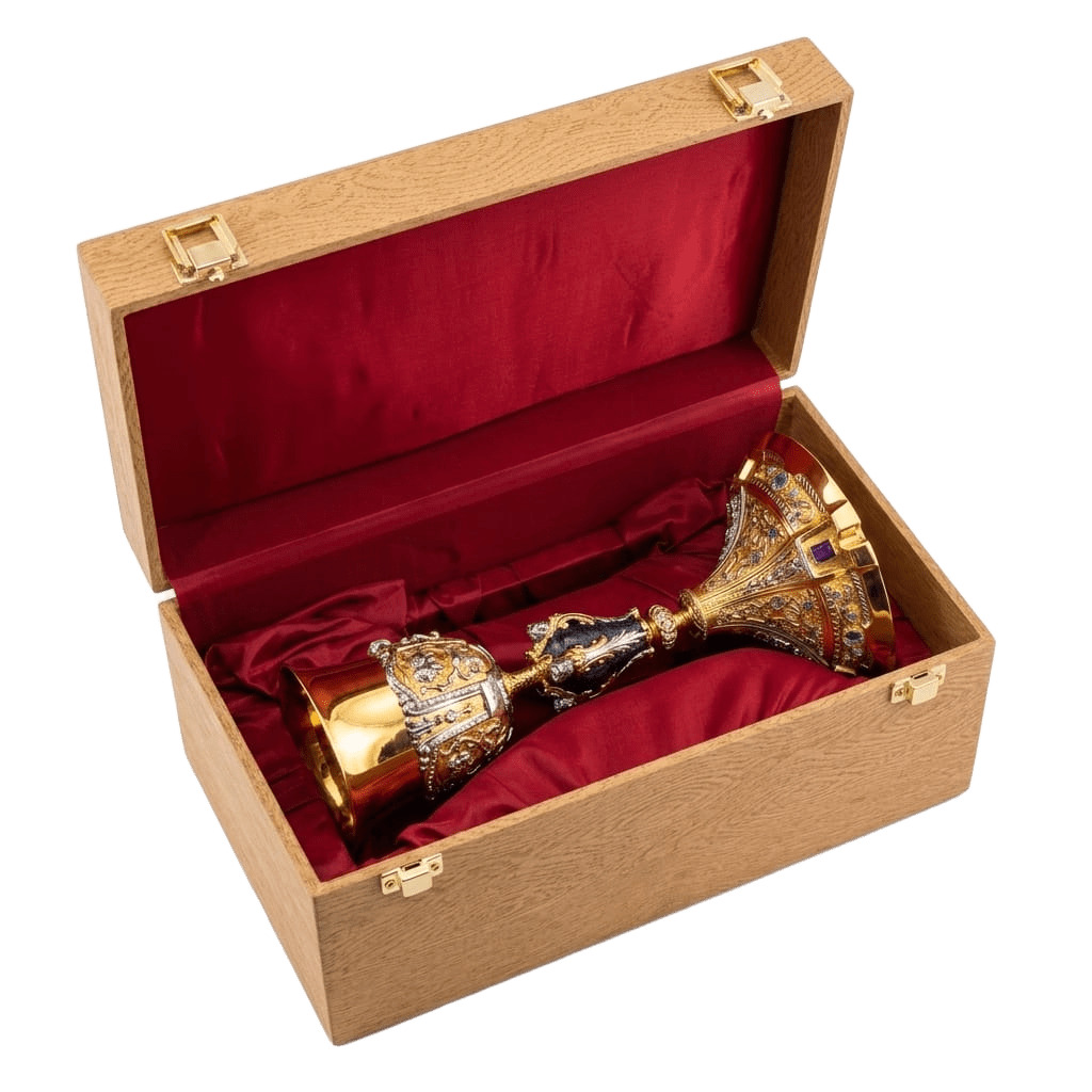 Para valorizar ainda mais esta peça exclusiva, o cálice acompanha um estojo original de luxo em madeira, com acabamento externo natural e interior revestido em tecido vermelho acolchoado. Este estojo foi desenvolvido especialmente para proteger e conservar o cálice com segurança, além de proporcionar uma apresentação sofisticada e à altura da nobreza da peça.