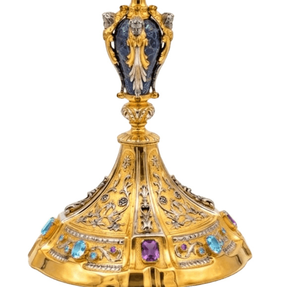 Este magnífico cálice de luxo é uma verdadeira obra de arte sacra, desenvolvido para elevar a solenidade das celebrações litúrgicas com imponência, beleza e profundo significado espiritual. Produzido com acabamento refinado e banhado a ouro de alto padrão, destaca-se pelo brilho intenso e pela riqueza de detalhes em cada parte da peça.