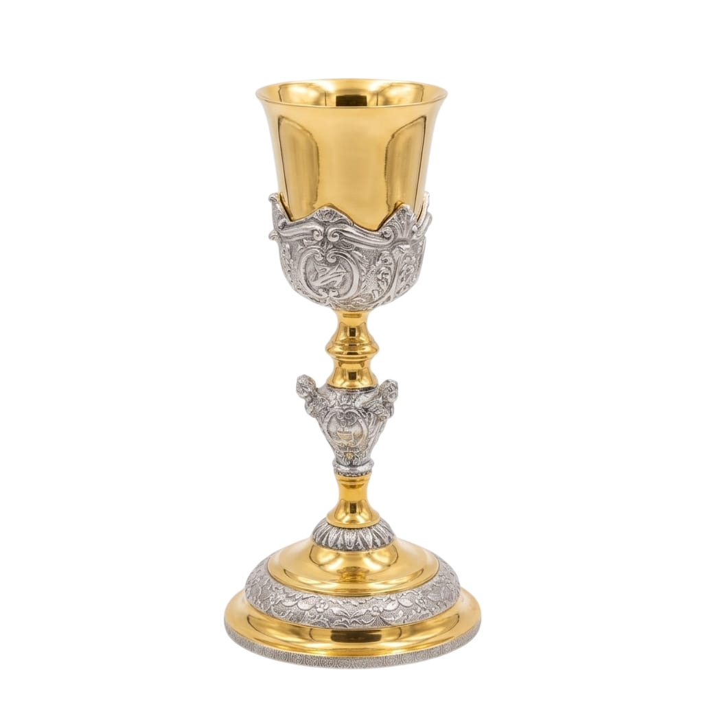 Cálice litúrgico de presença imponente, ricamente trabalhado em estilo barroco, ideal para celebrações solenes que exigem beleza, tradição e profundidade simbólica. Sua composição bicolor, unindo o dourado luminoso ao acabamento prateado ornamentado, confere um contraste nobre que valoriza cada detalhe da peça.