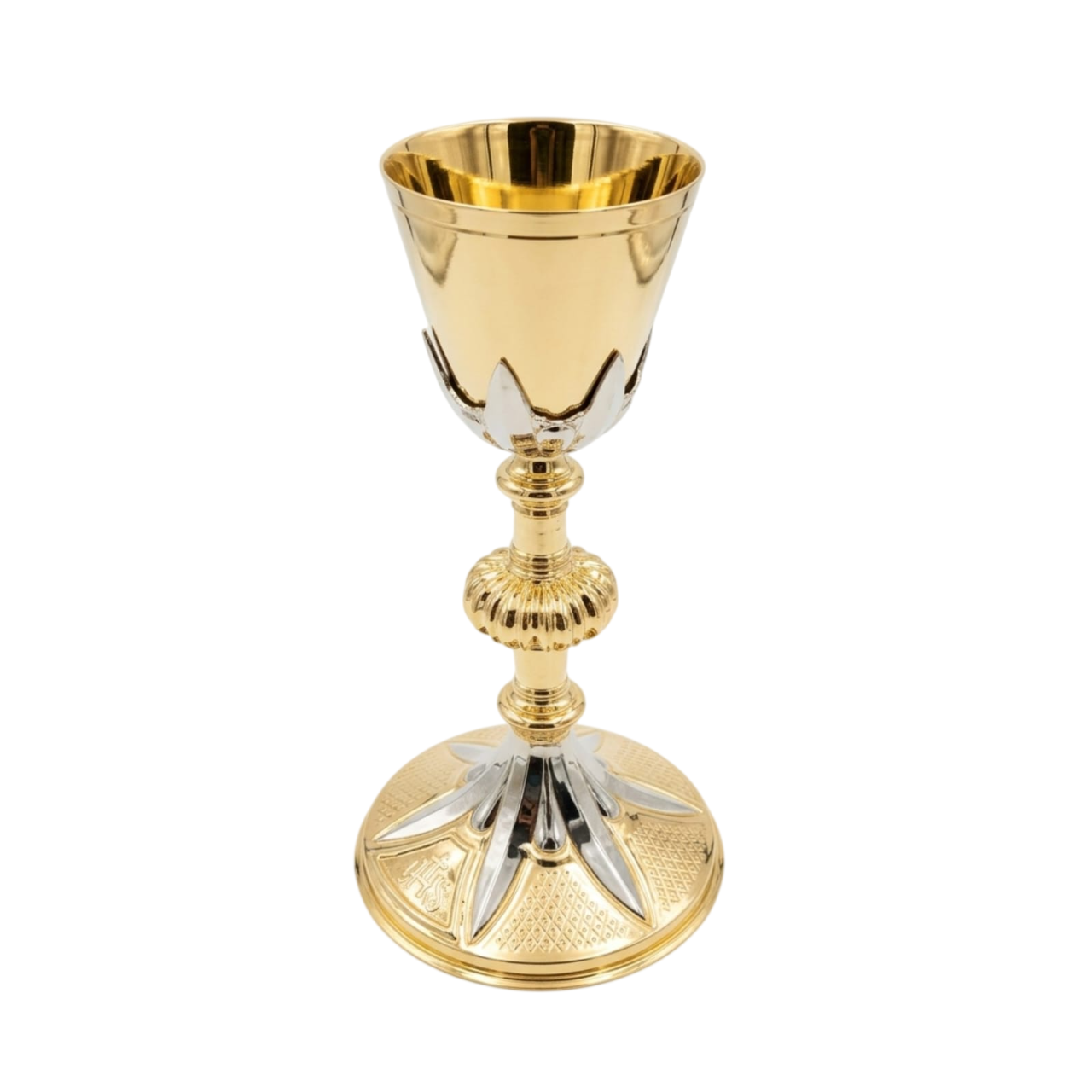 Sua copa ampla e lisa proporciona destaque à funcionalidade, enquanto o corpo é enriquecido por detalhes delicados no nó central, facilitando o manuseio durante a celebração. A base ornamentada, com relevos em acabamento bicolor, traz um toque artístico e simbólico, valorizando ainda mais a peça.