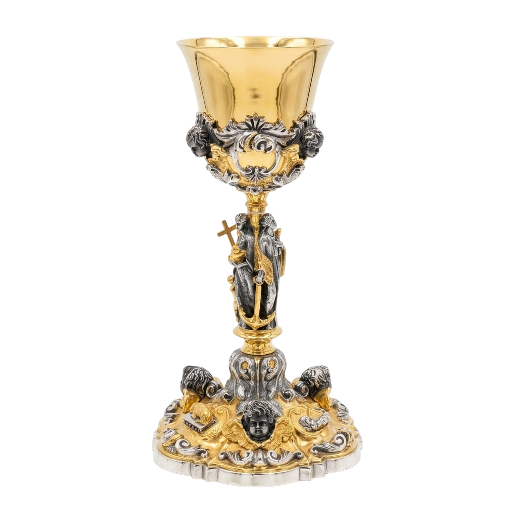 A copa dourada, com acabamento interno polido, garante não apenas beleza, mas também as condições ideais para o uso litúrgico. Logo abaixo, o nó e a base apresentam detalhes minuciosamente trabalhados, com relevos artísticos que incluem figuras simbólicas, anjos e elementos decorativos que remetem ao sagrado, proporcionando profundidade e expressão à peça.