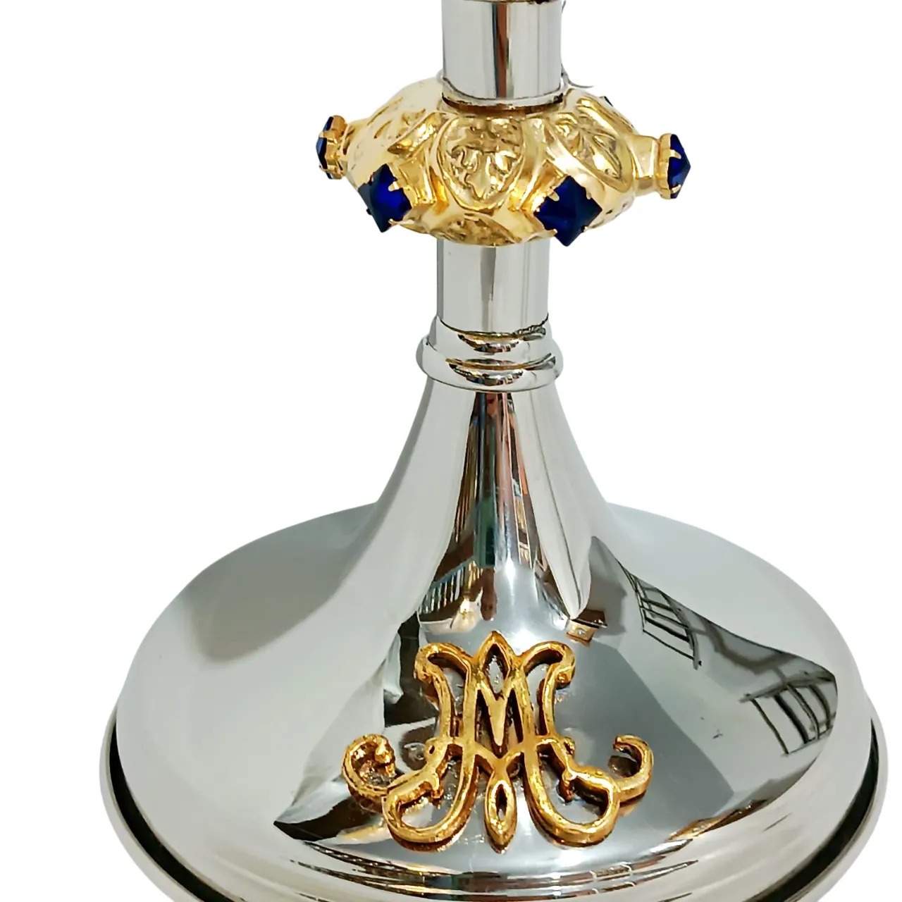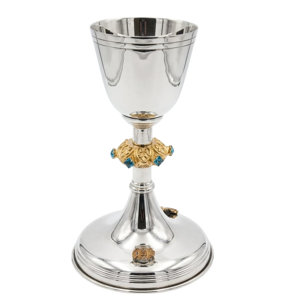 O Cálice Mariano 22,5cm Prata é uma opção de vaso sagrado singelo e digno. Ele carrega em sua base um M estilizado. Nessa opção, apresenta pedras azuis em sua coluna.