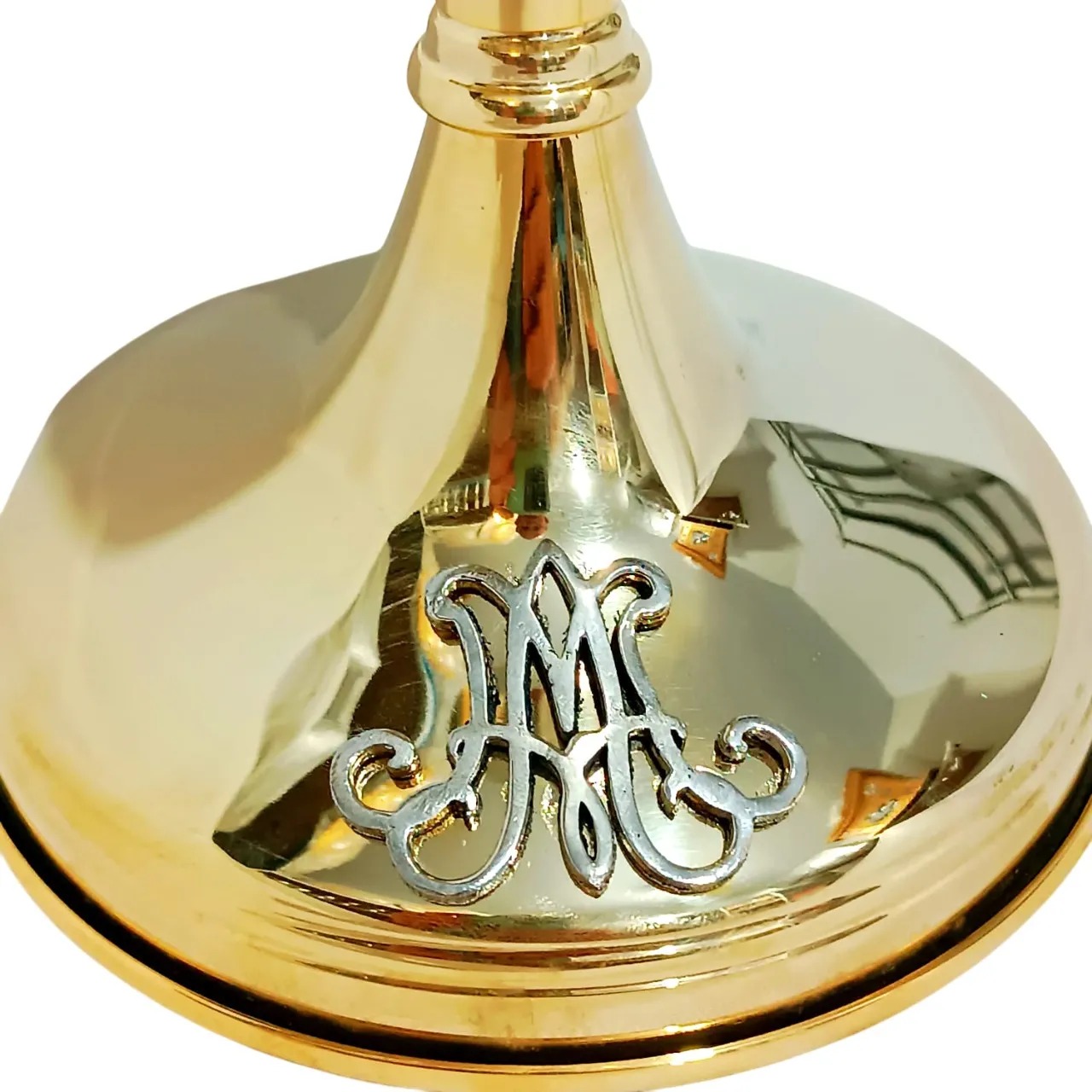 O Cálice Mariano 22,5cm é uma opção de vaso sagrado singelo e digno. Ele carrega em sua base um M estilizado. Nessa opção, apresenta pedras azuis em sua coluna.