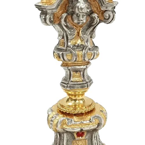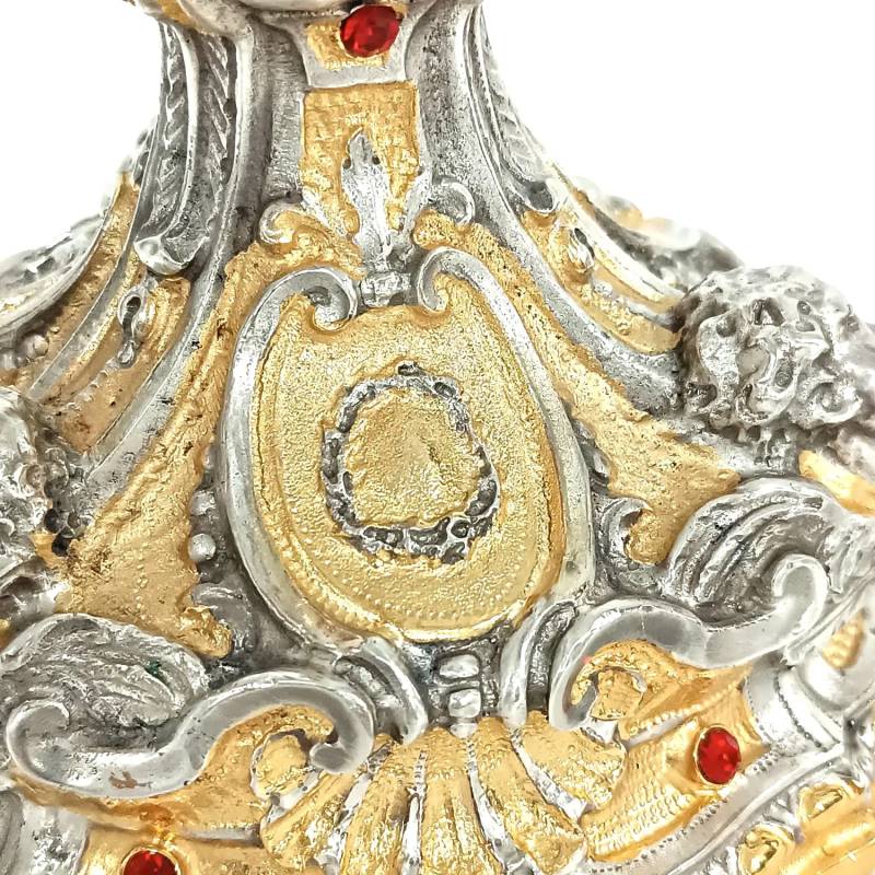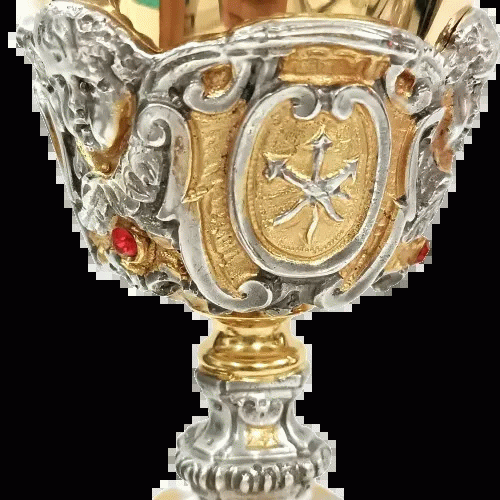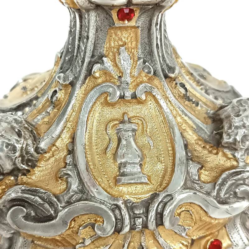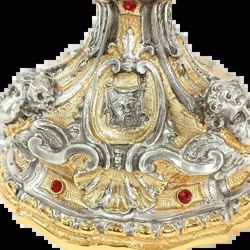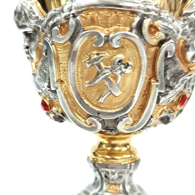 Imponente cálice, em estilo único. Esse belíssimo cálice possui como temas predominantes a Paixão de Nosso Senhor Jesus Cristo.