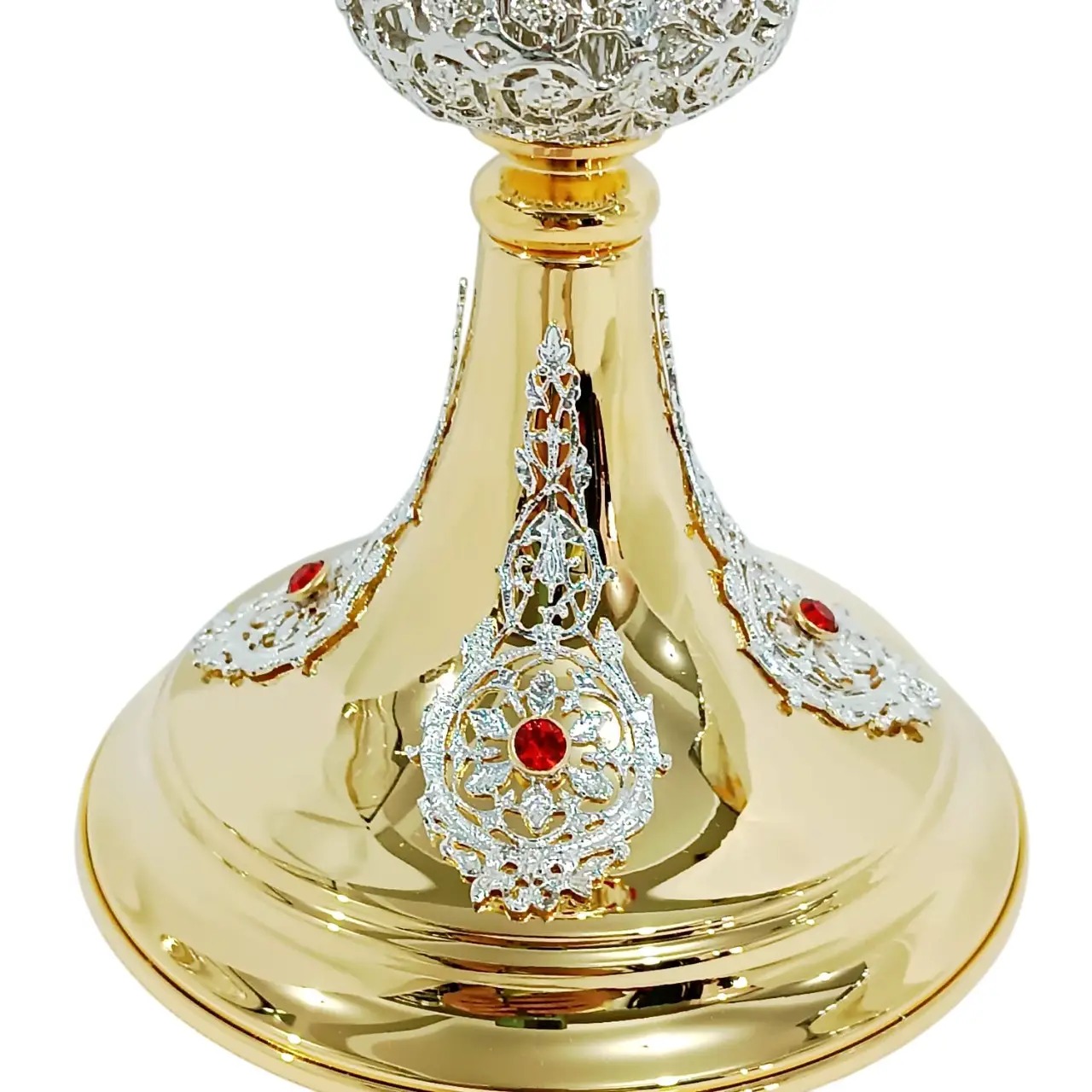 O Cálice Polonês é feito de metal, com polimento especial, banhado a ouro 24k e com pedras cor vermelha de altíssima qualidade. Na base ornamentado com medalhão prateado da Sagrada Família. Lindo trabalho em filigrana prata.