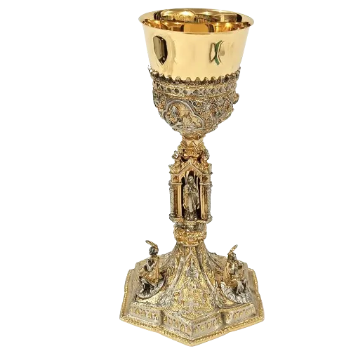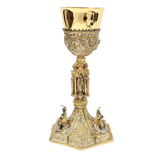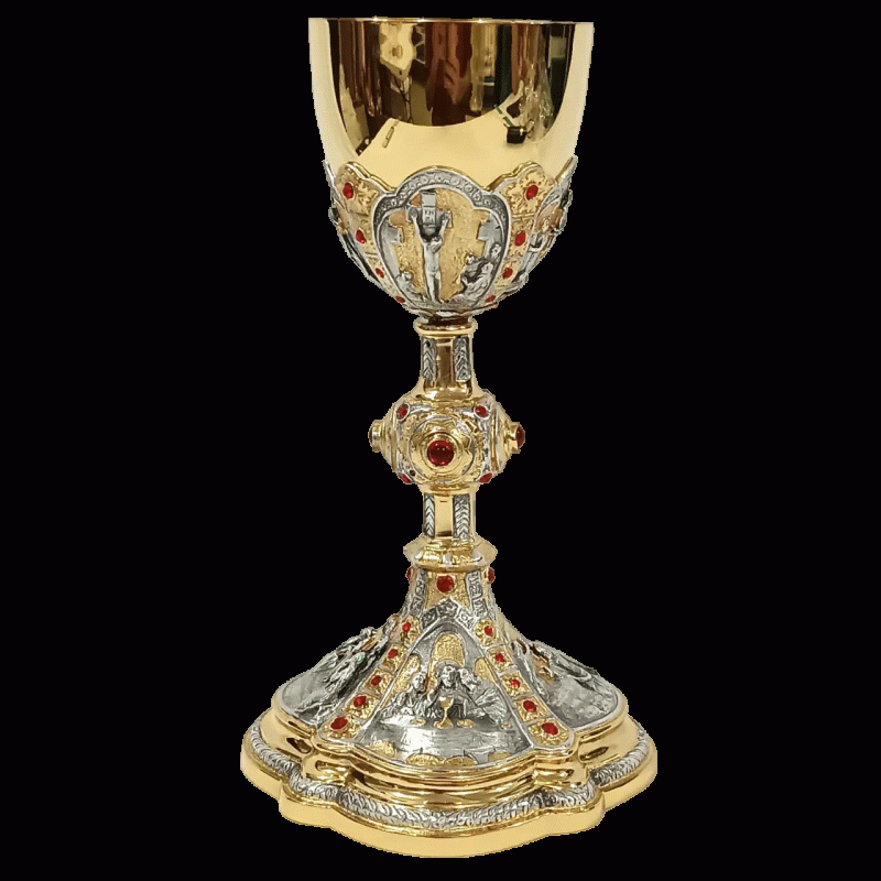 Cálice em latão produzido na Itália, por artesãos experientes. O Cálicie Trigo e Uva é totalmente cinzelado a mão (arte de entalhar o metal), num processo artístico únco. Logo após ele é banhado em prata e a copa em ouro 24k. fundido e cinzelado, com banho de níquel, e copa banhada a ouro.