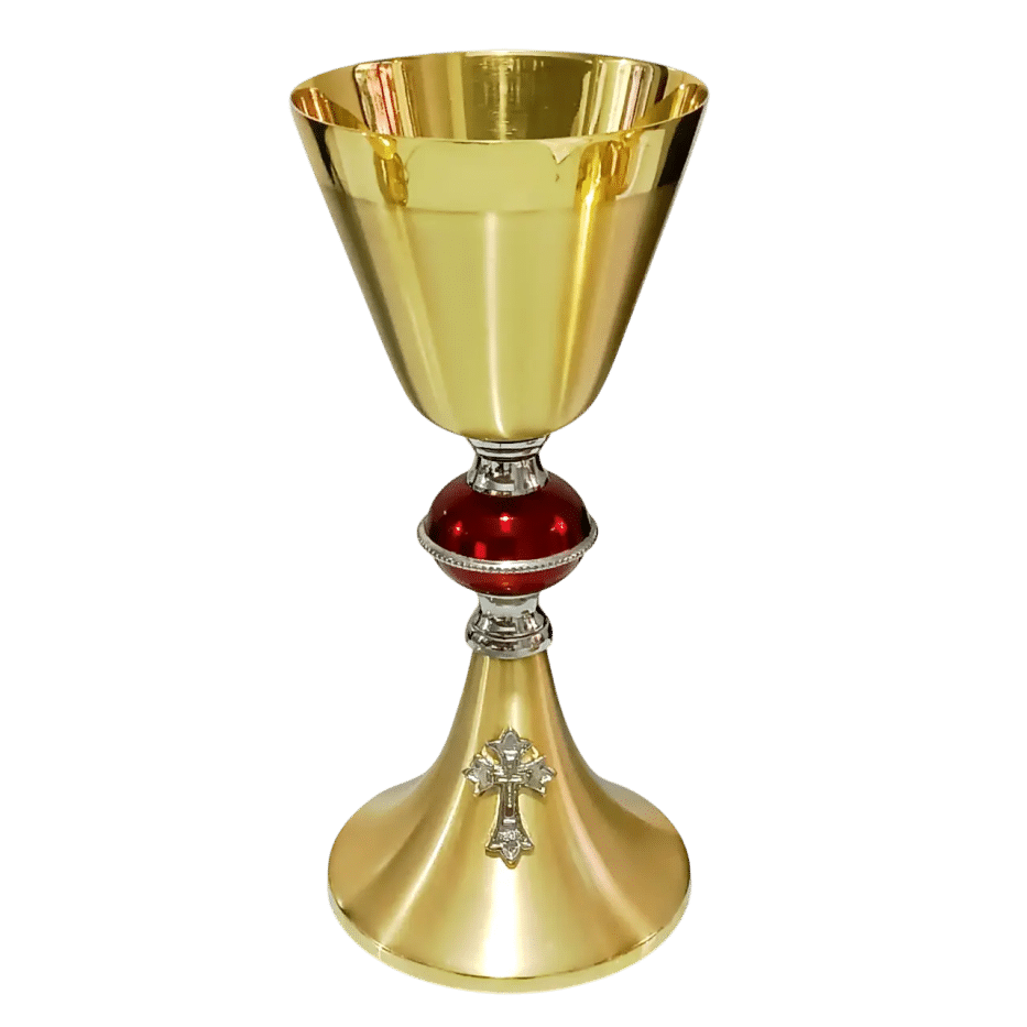 Cálice litúrgico italiano, confeccionado em latão polido e banho dourado. Este cálice se destaca pelo esmalte vermelho em sua coluna, que realça sua beleza e pela cruz delicadamente inserida na base. Além disso, o banho prateado adorna a coluna, acrescentando um toque de sofisticação. Uma peça moderna e única, além de imponente: são 27cm de altura.