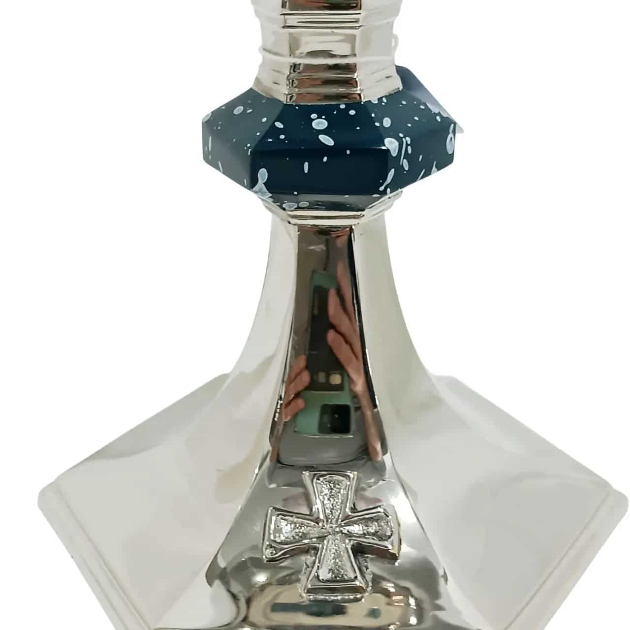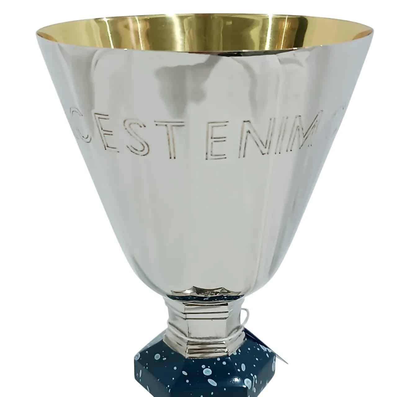 Cálice italiano “Sanguis Mei”, produzido em latão fundido com banho de níquel e interior dourado. Possui inscrição em latim na copa e cruz em relevo na base, com nó central esmaltado em azul, conferindo elegância e significado litúrgico à peça.