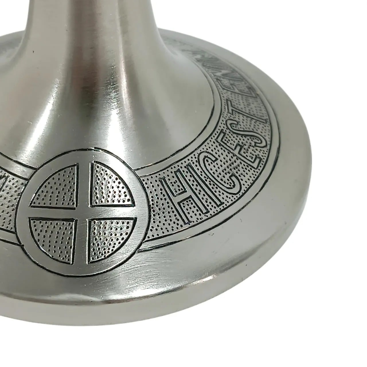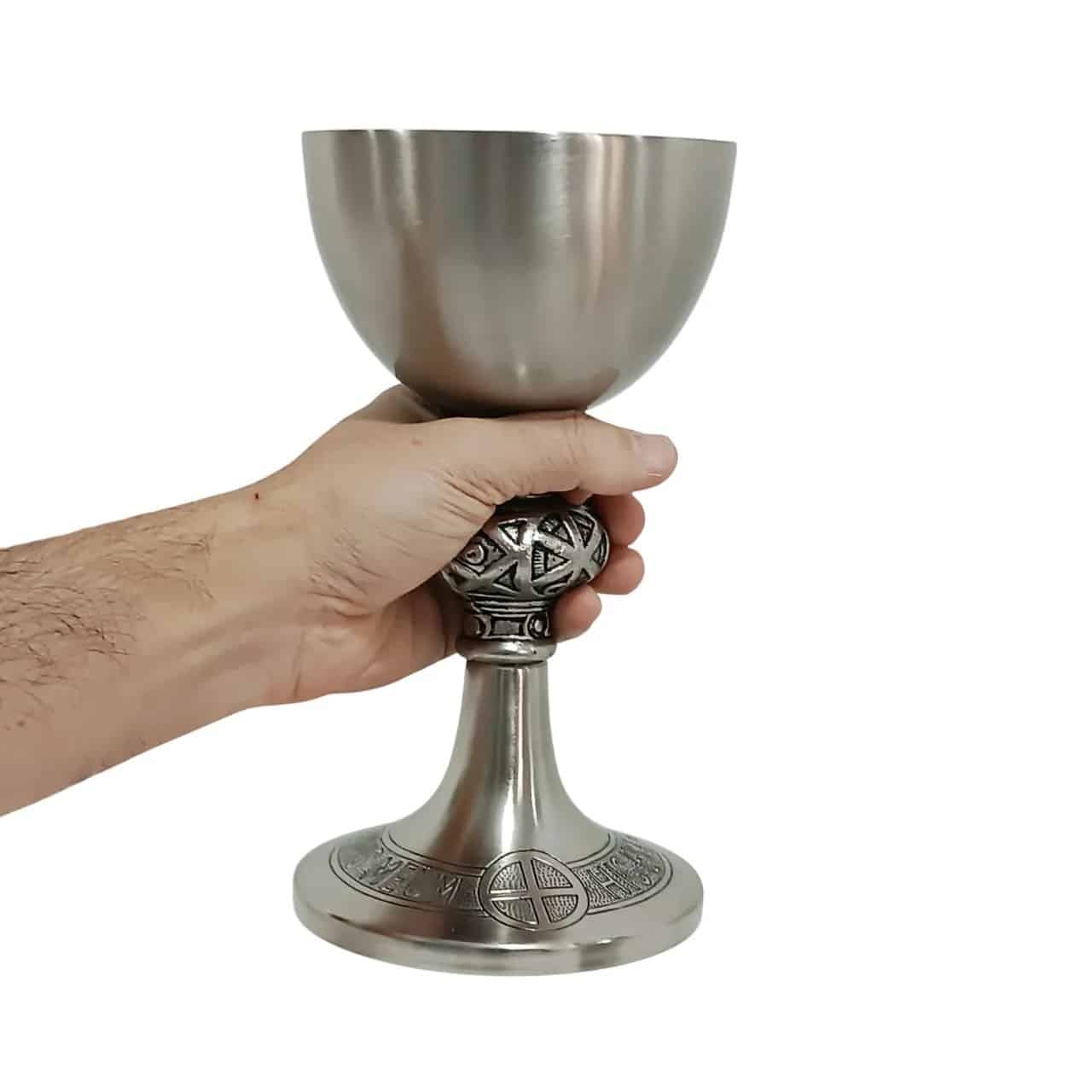 .Cálice litúrgico italiano “Sanguis Meus”, confeccionado em metal fundido com banho de prata envelhecida e interior dourado.