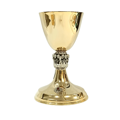 Cálice produzido em liga metálica com banho de ouro 24k. Na coluna central a representação da Última Ceia em metal, com banho prata, produzindo um contraste lindo. Além de uma cruz e uma pedra vermelha na base