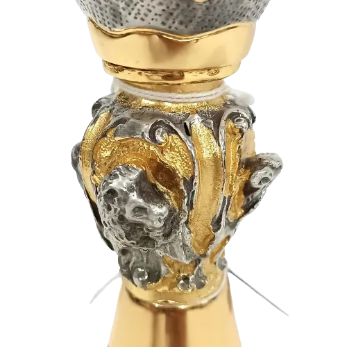 Cálice feito em latão repuxado, ricamente cinzelado (arte milenar de esculpir o metal manualmente). Apresenta em sua coluna a figura dos 4 Evangelistas.