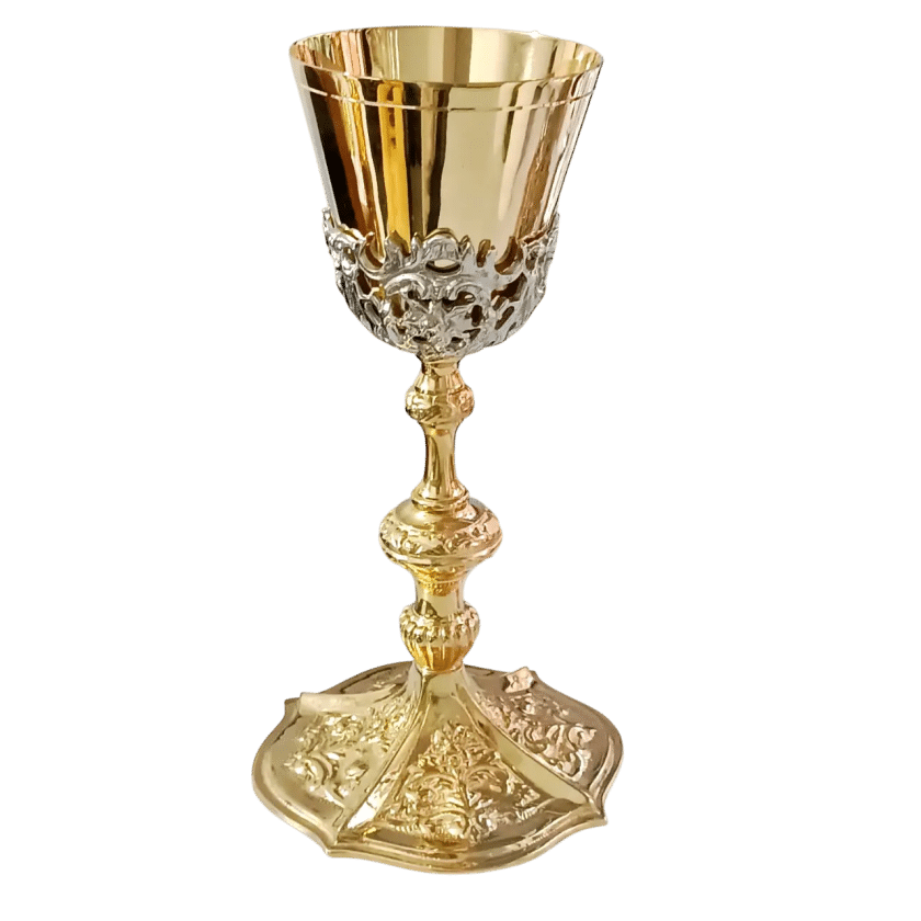 Cálice São João Paulo. Liga metálica com banho de ouro na base com detalhes em relevo. Não acompanhado da patena.