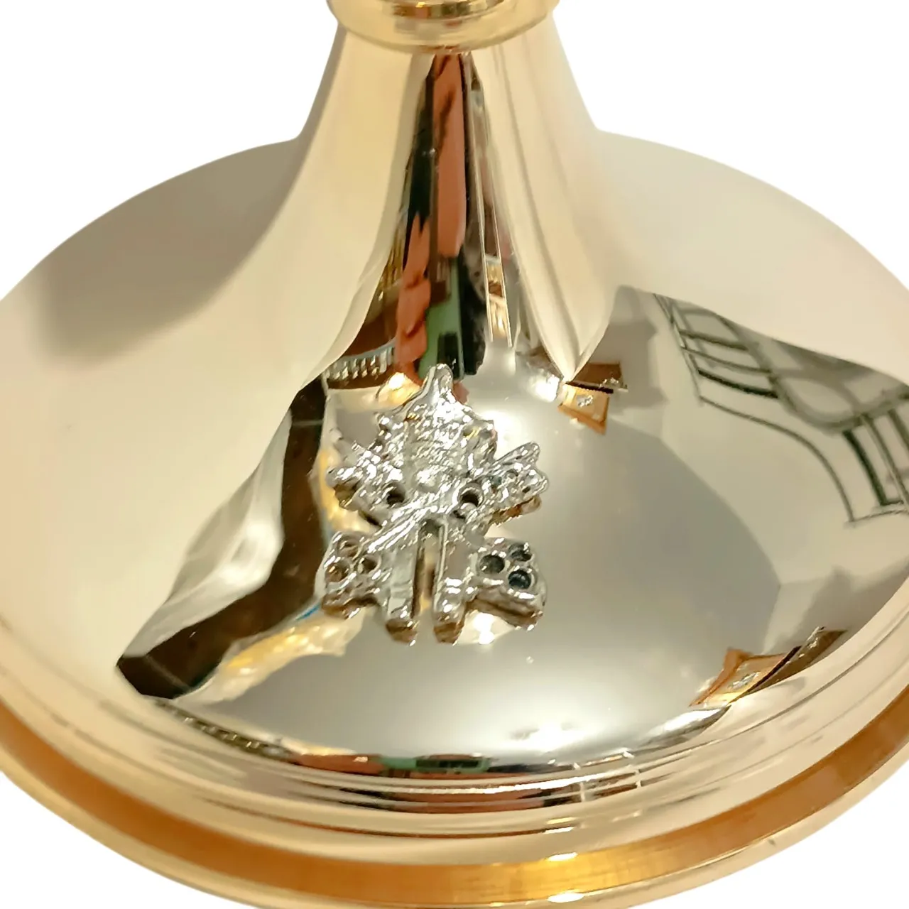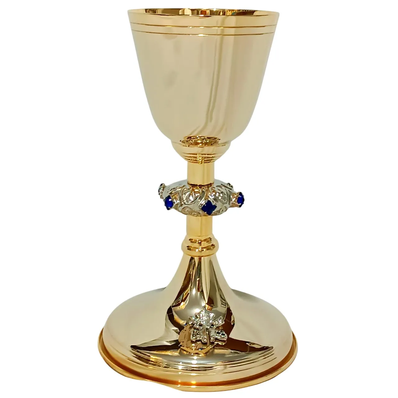 O Cálice São Pedro é uma opção de vaso sagrado singelo e digno. Ele carrega em sua base as Armas Pontifícias. Nessa opção, apresenta pedras azuis em sua coluna.