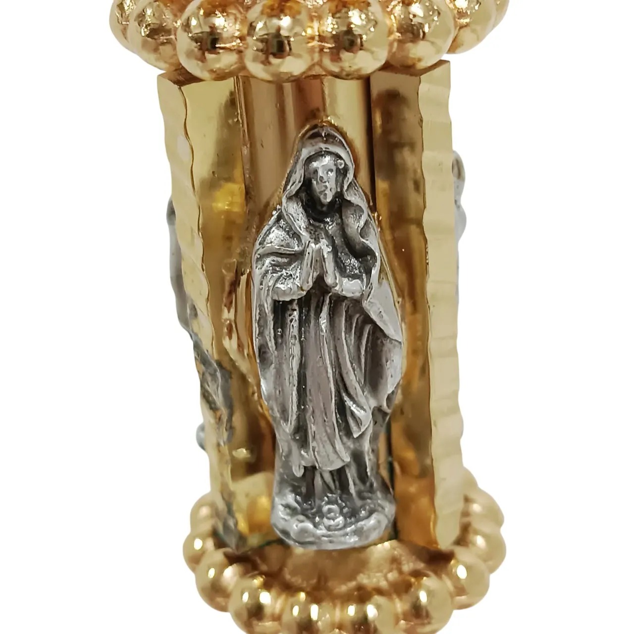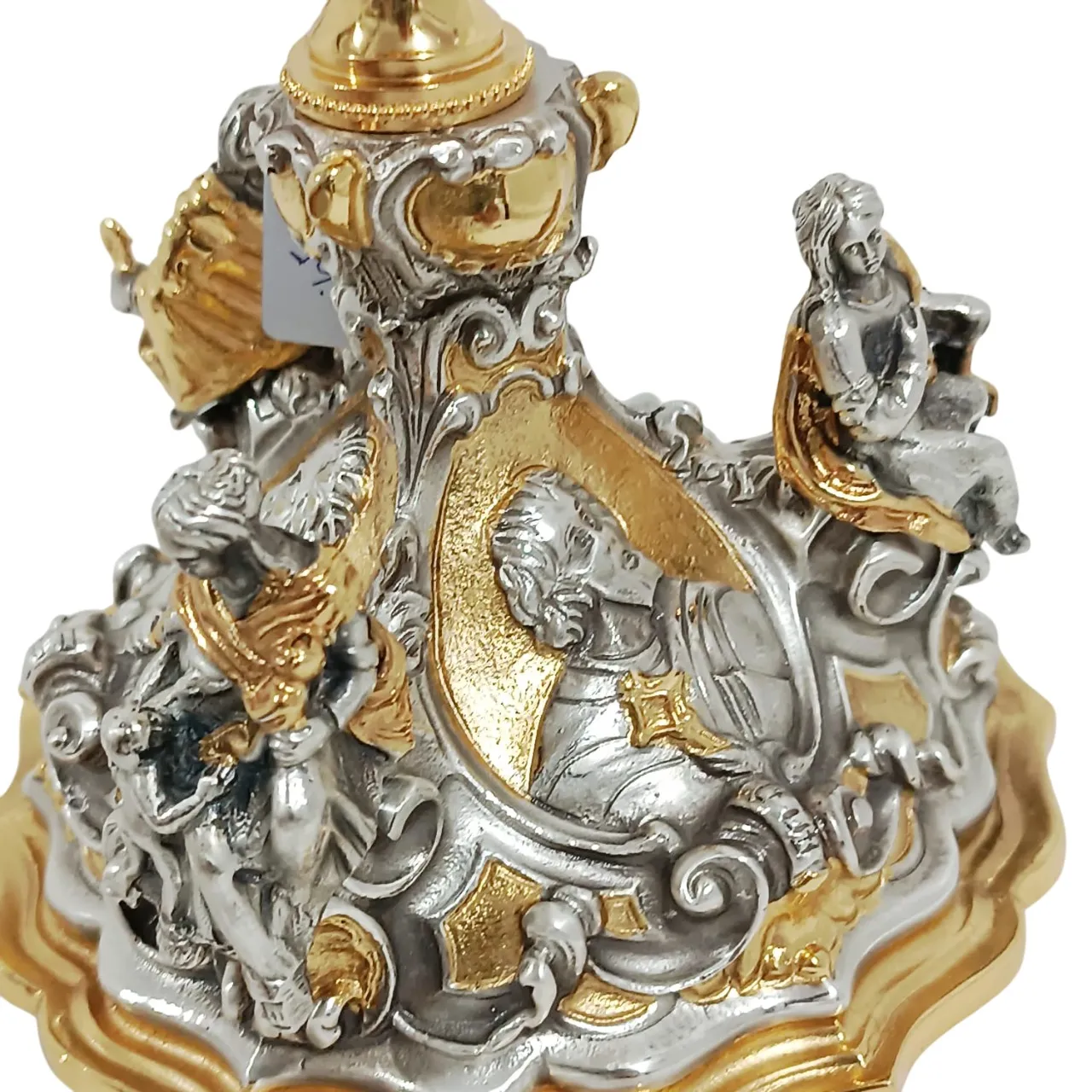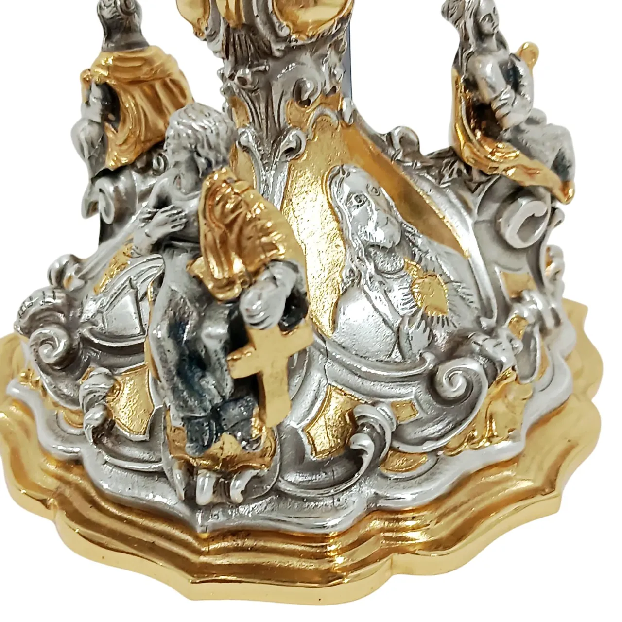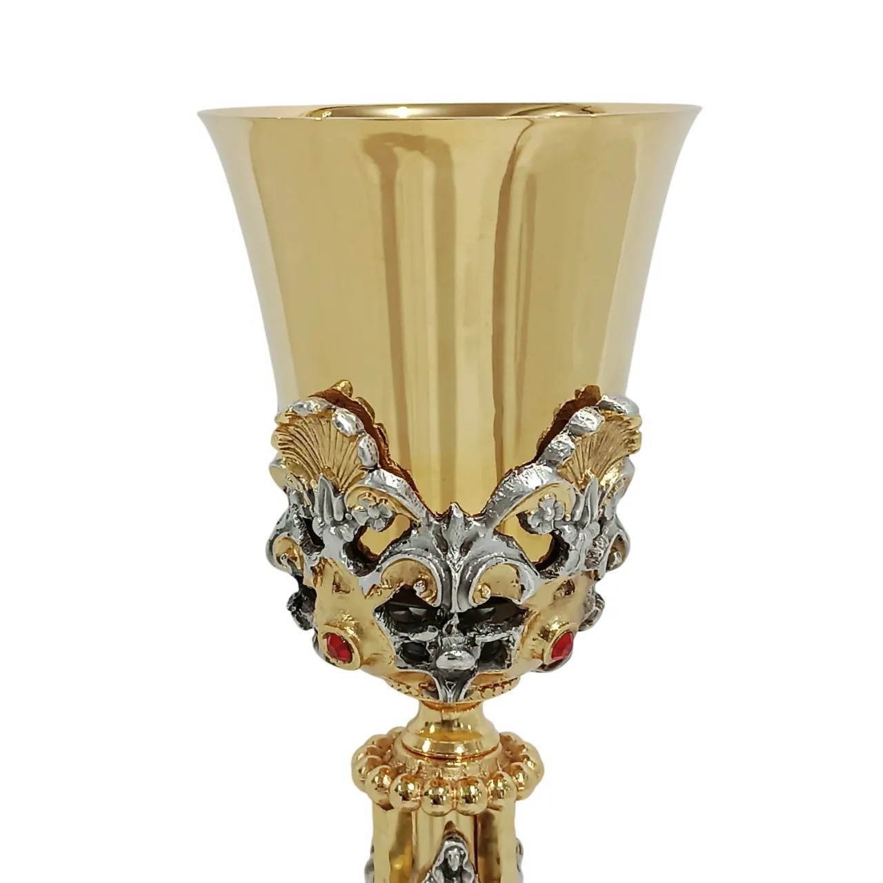 Cálice italiano produzido em cera perdida, técnica artesanal que garante riqueza de detalhes e acabamento refinado. Peça em metal fundido, com banho bicolor – de prata envelhecida e em ouro 24k – conferindo nobreza e resistência ao uso litúrgico.