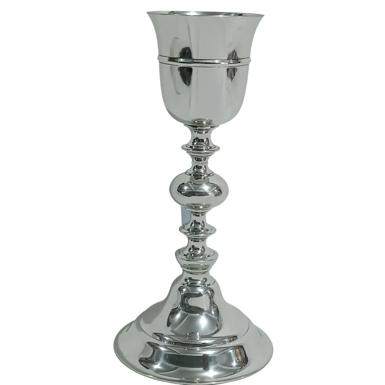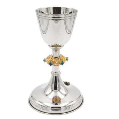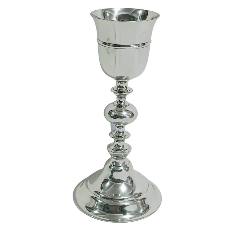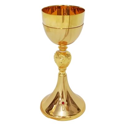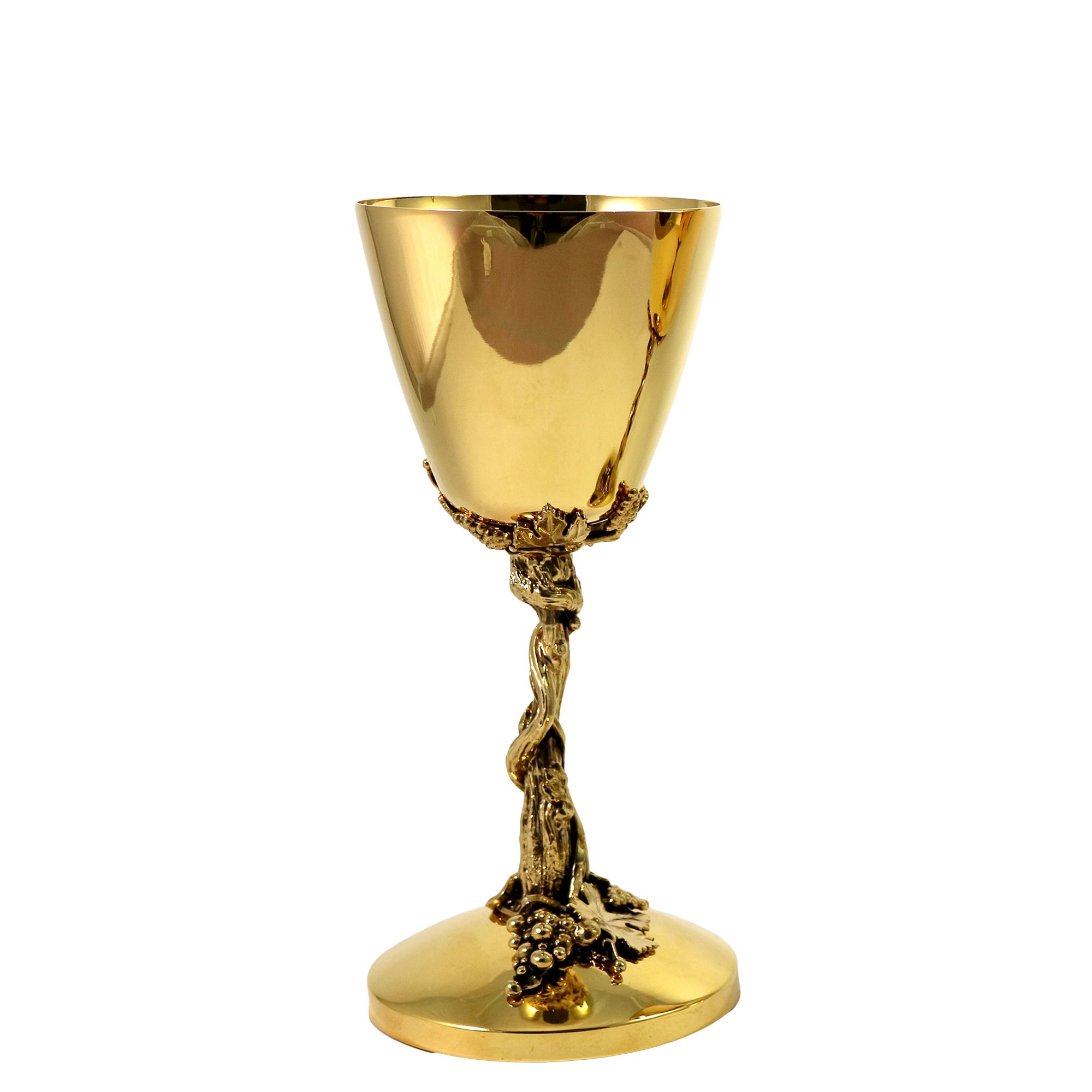 Cálice em latão dourado com pires e nó representando folhas de videira e rebentos de videira com acabamento em ouro brunido.